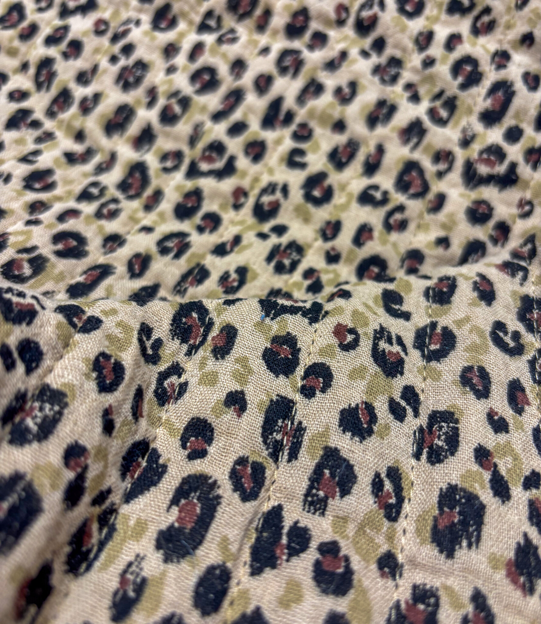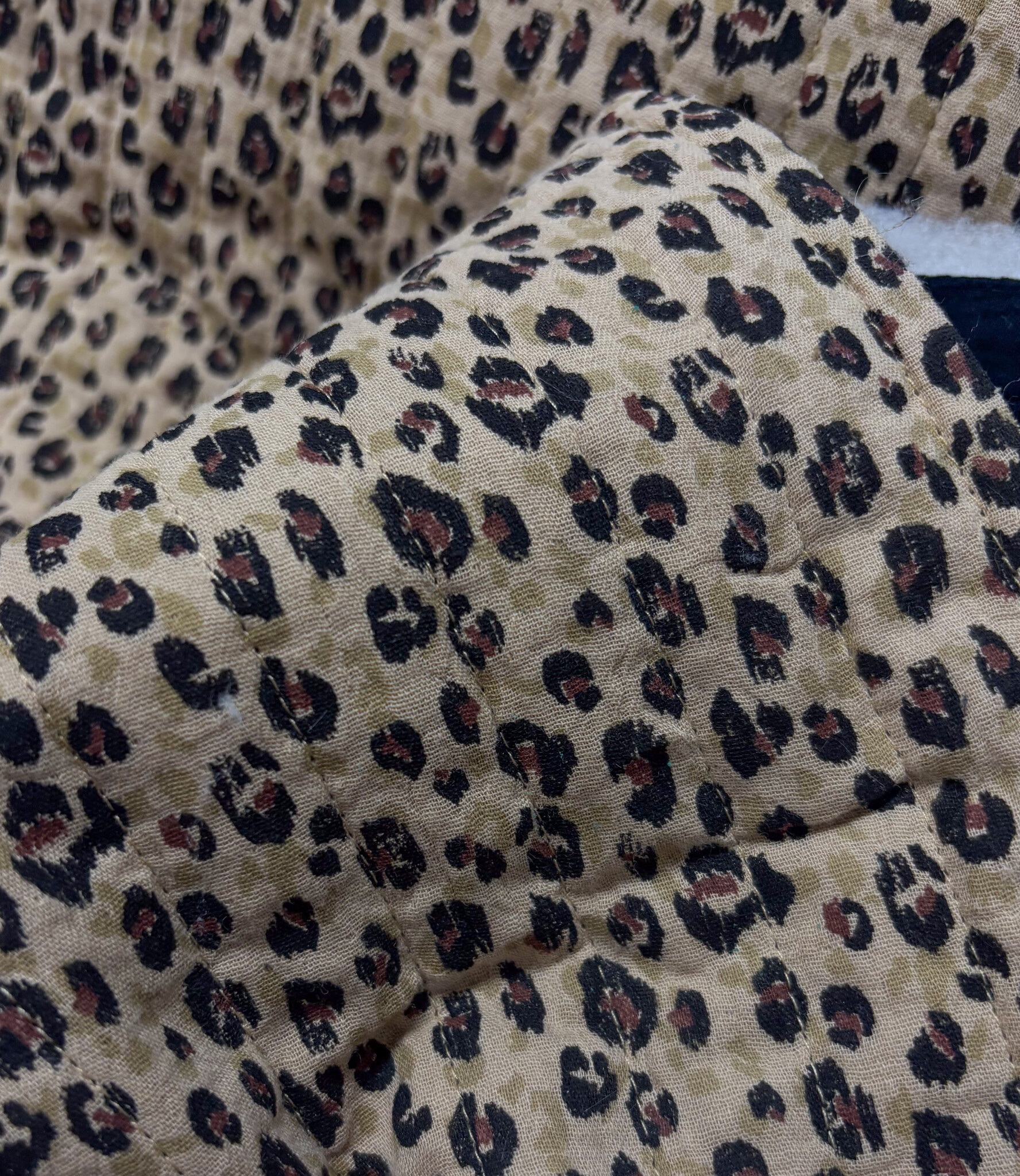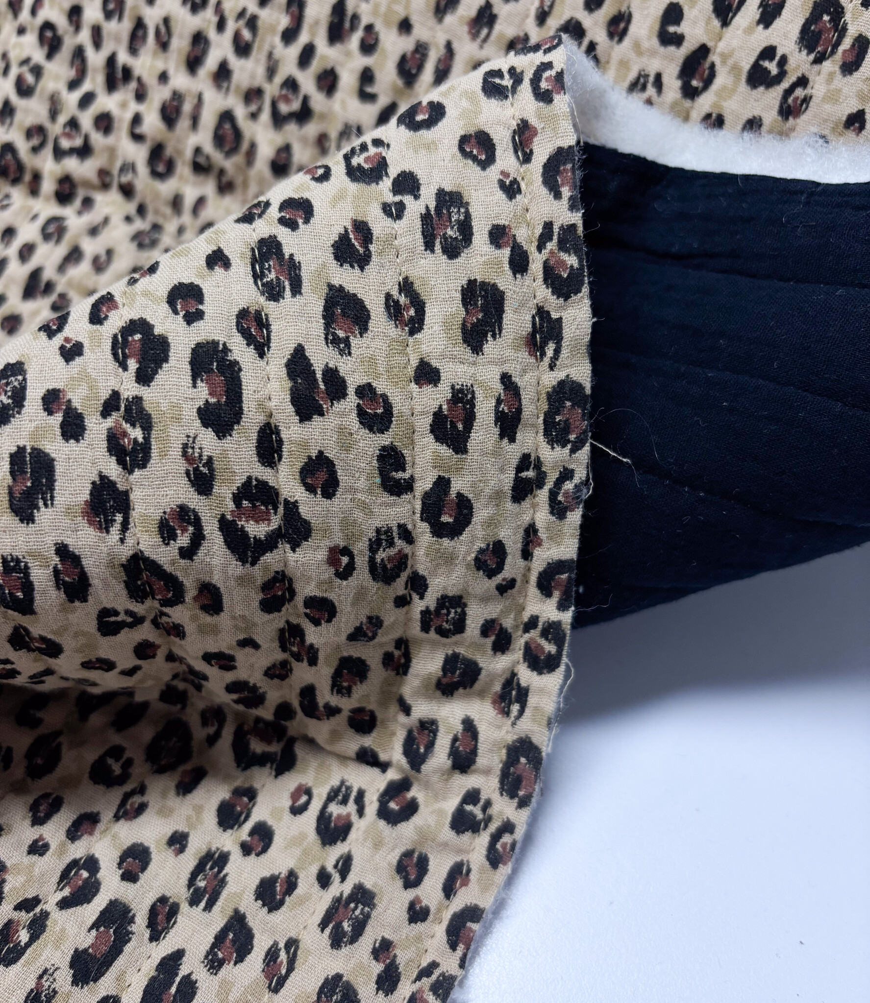Een zachte gewatteerde double gauze tetra met luipaardprint. Double face, dus deze stof is bruikbaar langs beide kanten. Aan de ene kant heeft deze stof een luipaardprintje, aan de andere kant is ze zwart. Perfect voor jasjes, bodywarmers, dekentjes, ... Perfect voor de Junna vest van Bel 'Etoile. Ook perfect voor de Junna Bodywarmer (ritsvest) van Bel 'Etoile.