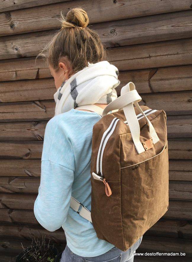 Een originele rugzak, gemaakt in oilskin. Deze gewaxte oilskin heeft een leerachtige uitstraling. Kan jij dit op je eentje? Koop dat het patroon op onze website.