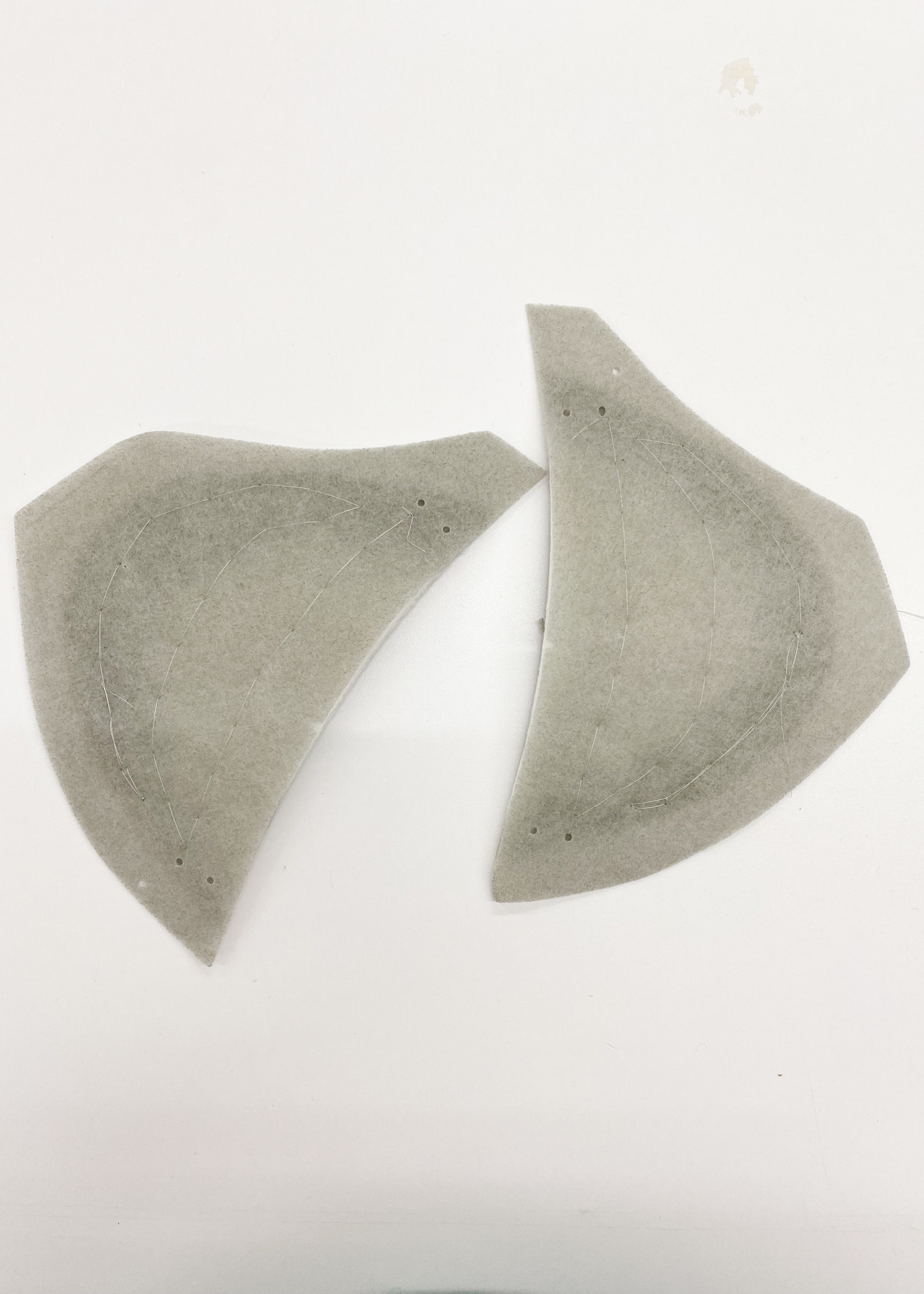 Onze schoudervullingen worden per paar verkocht en moeten tussen de buitenstof en de voering genaaid worden. Eerst naai je de snorretjes / flanken, dan pas de schoudervullingen.