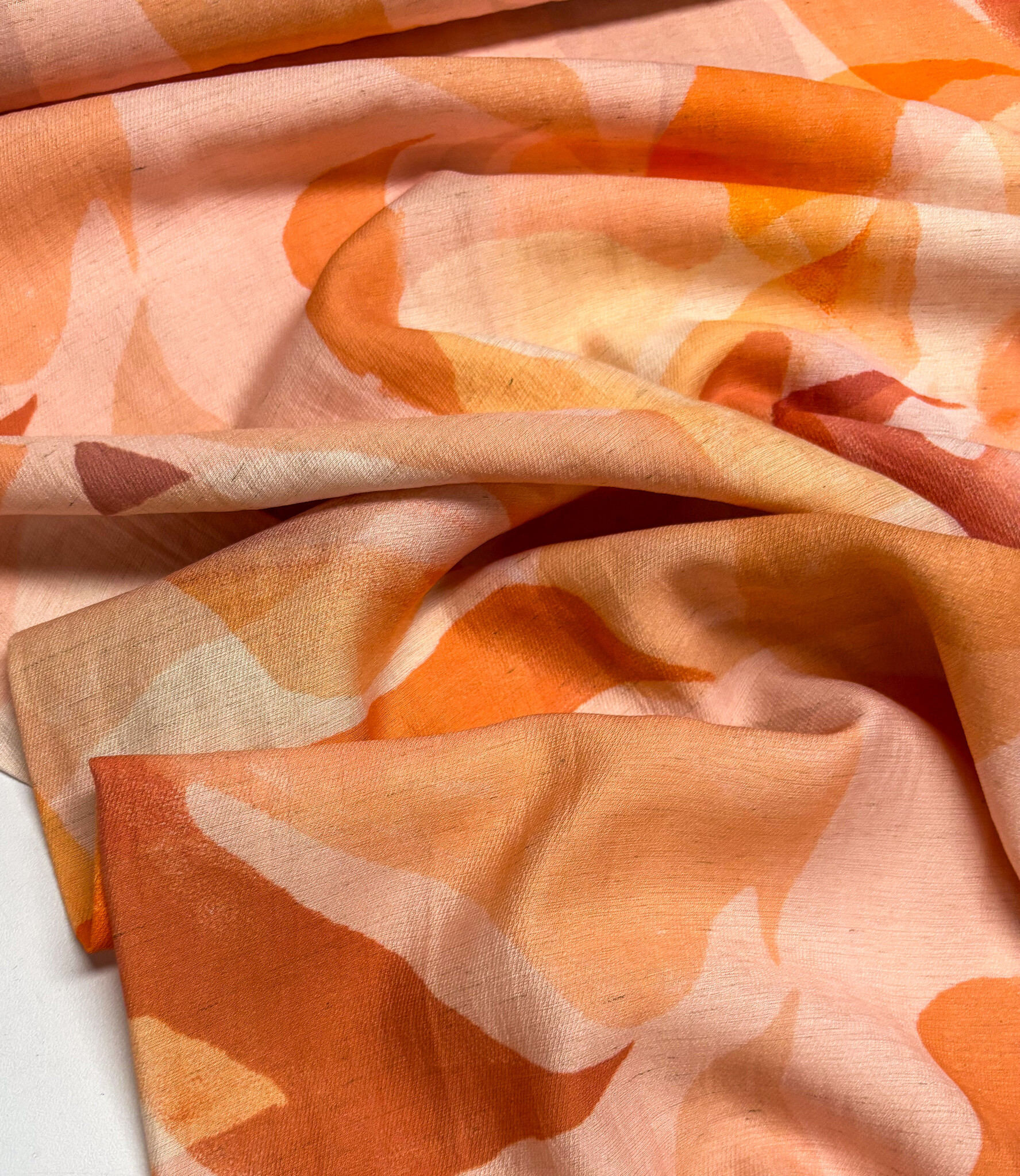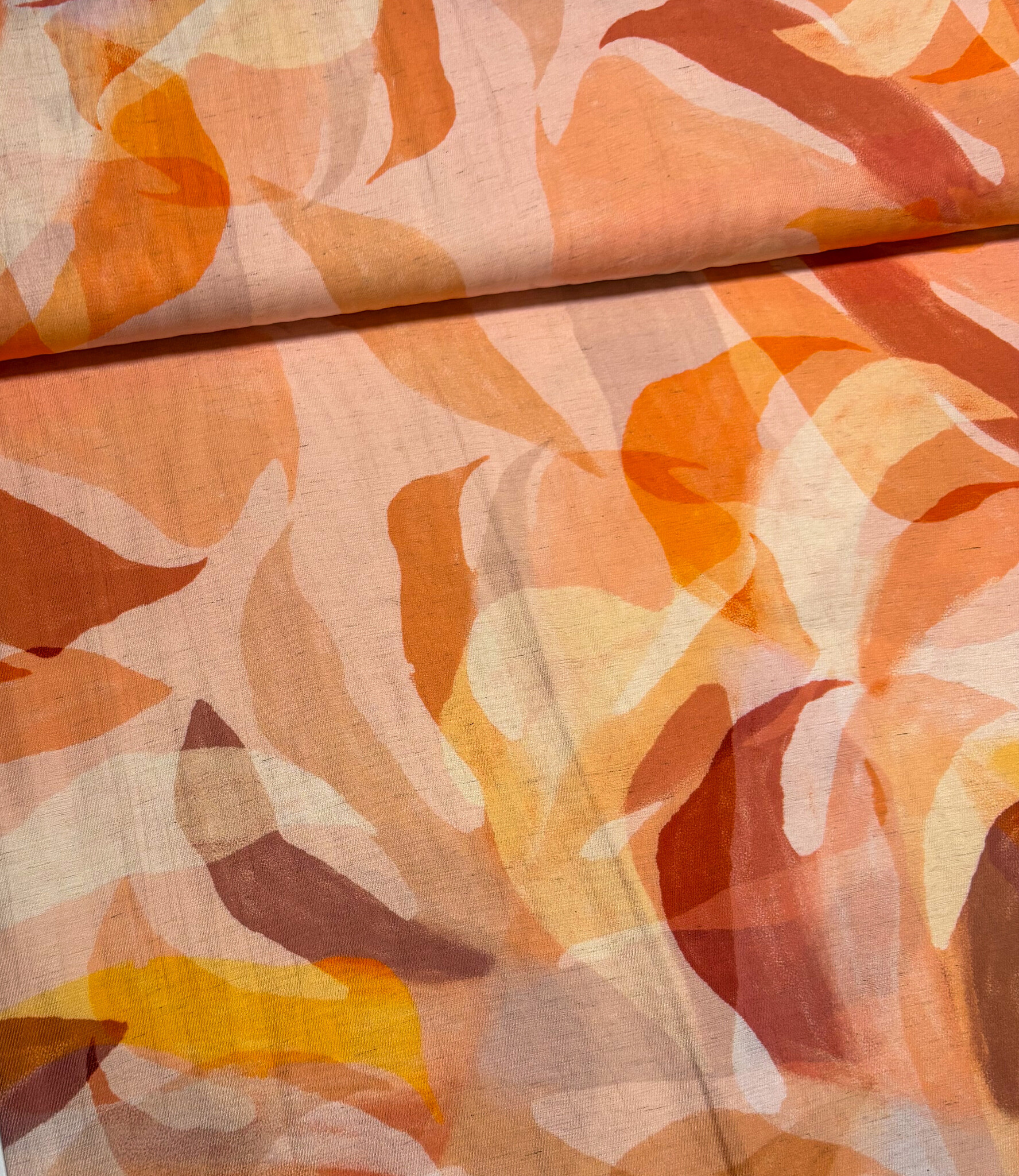 Een viscose linnen mix met oranje print.