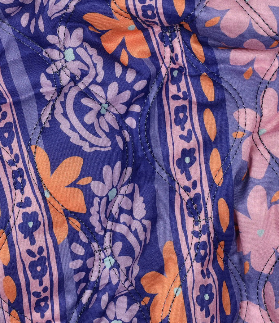 Een double face gewatteerde katoen met paarse en oranje print. Heel tof voor een Junna vestje, een grotere of kleinere tas, een dekentje, ...