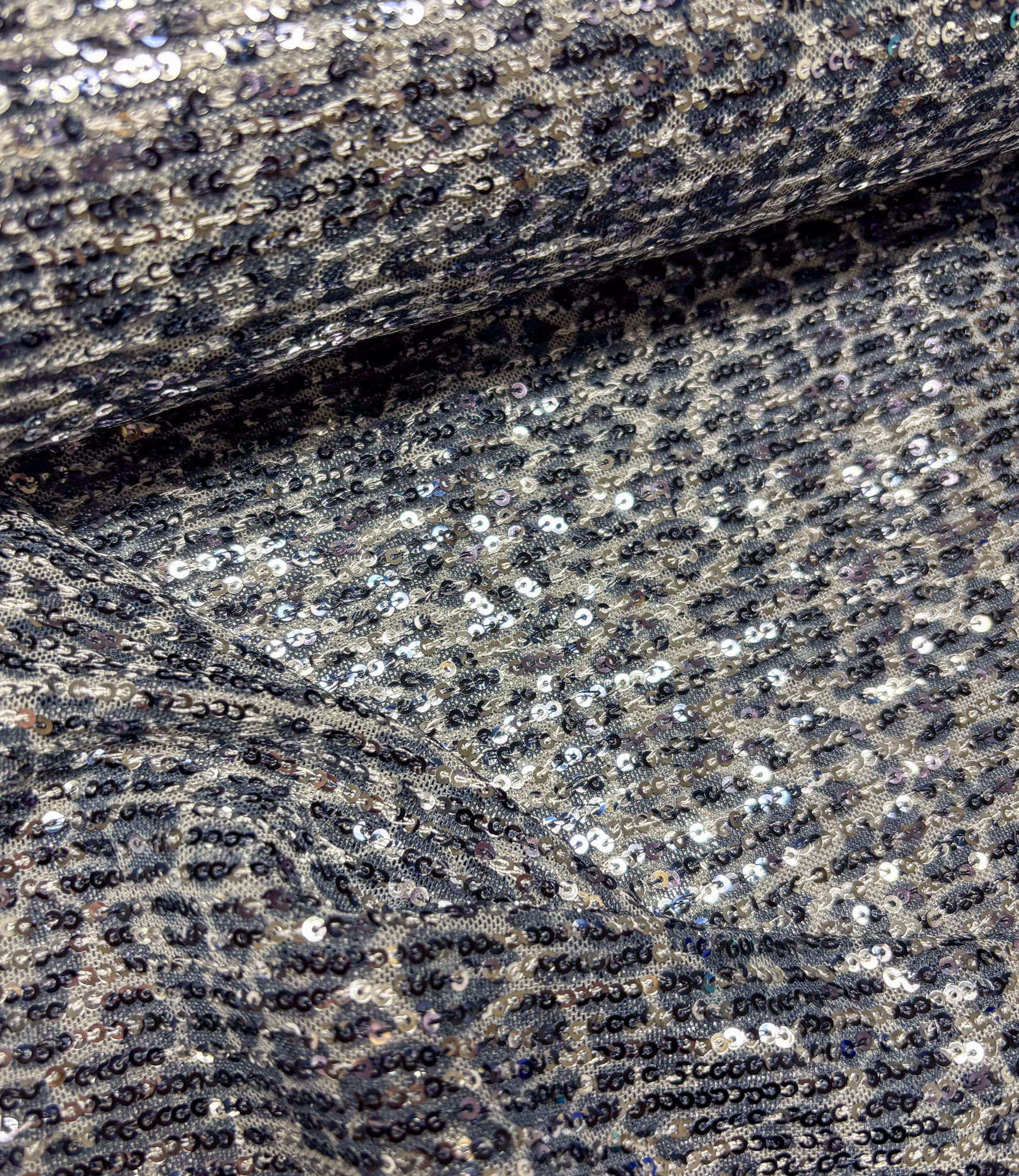 Een prachtige kwaliteit pailletten stof, de pailletten zijn in rijen op een mooie mesh met luipaardprint vastgezet.
