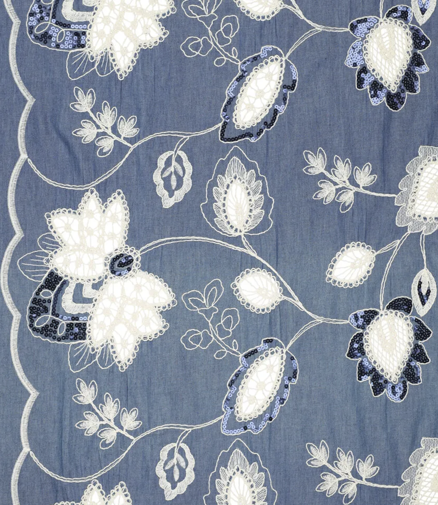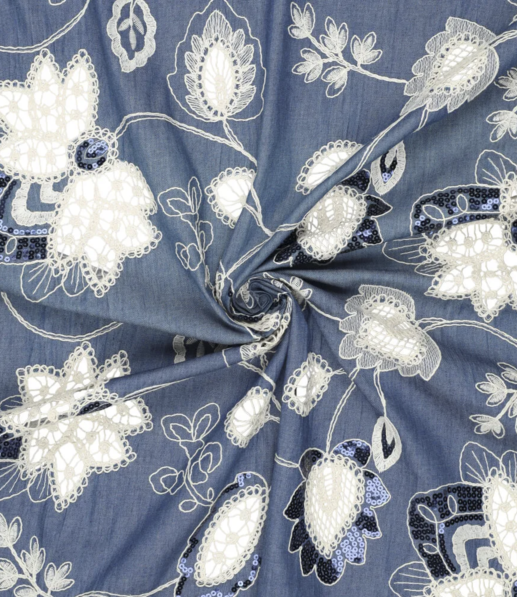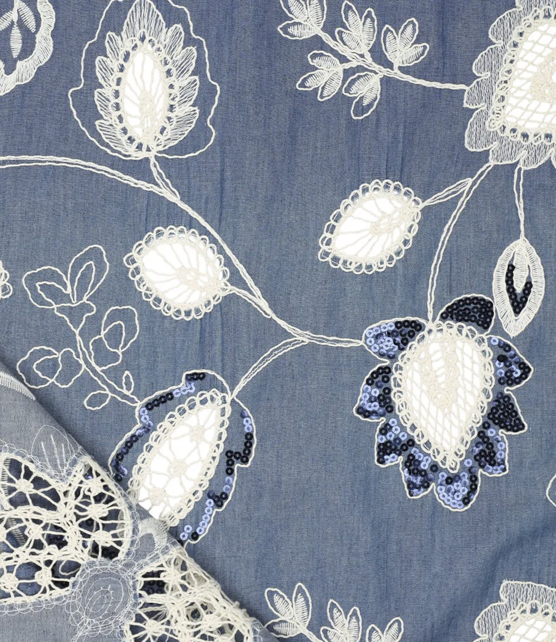 Mooie, soepele denim katoen met geborduurde bloemen en pailletten. Supermooi voor blouses en jurken.