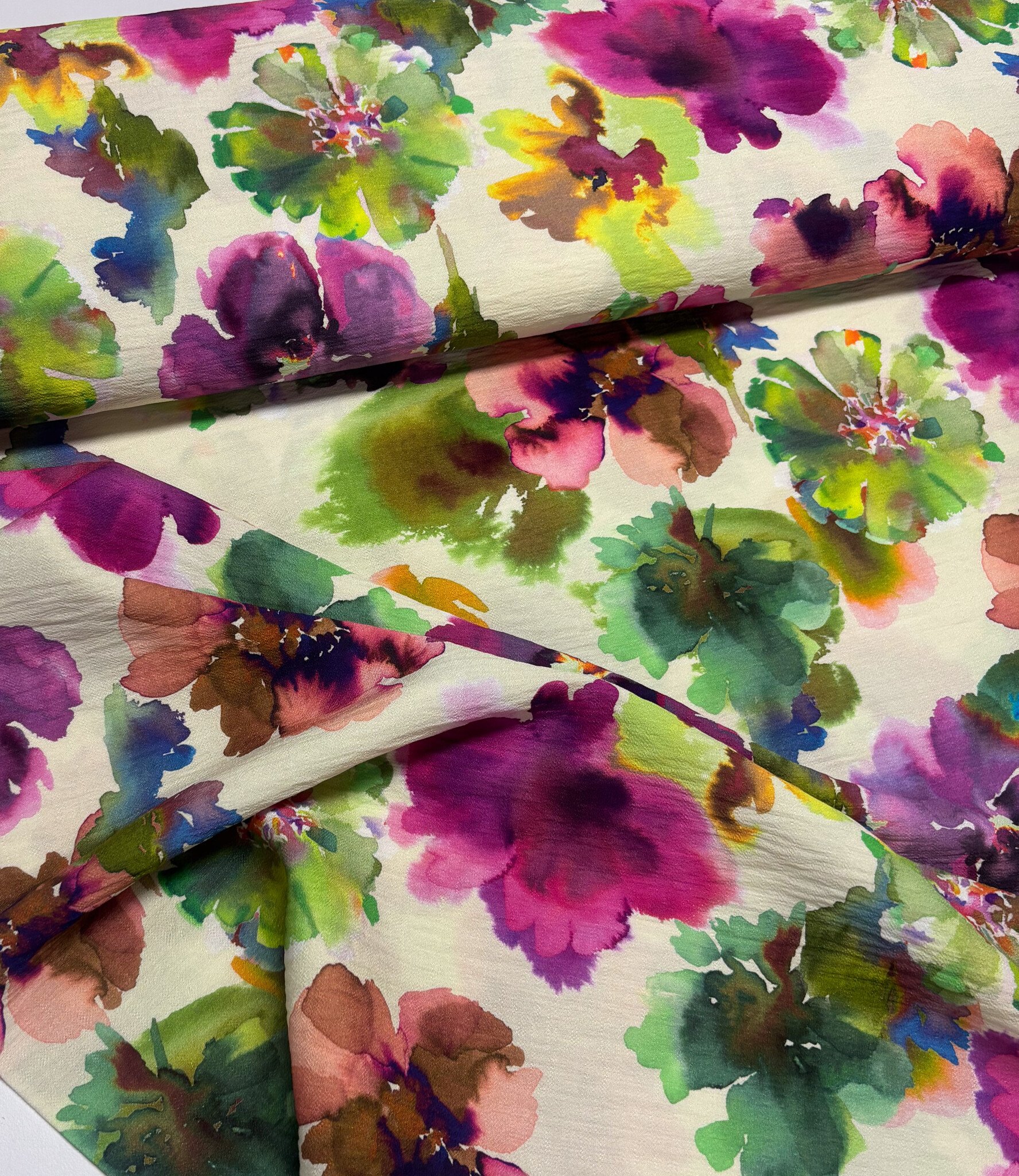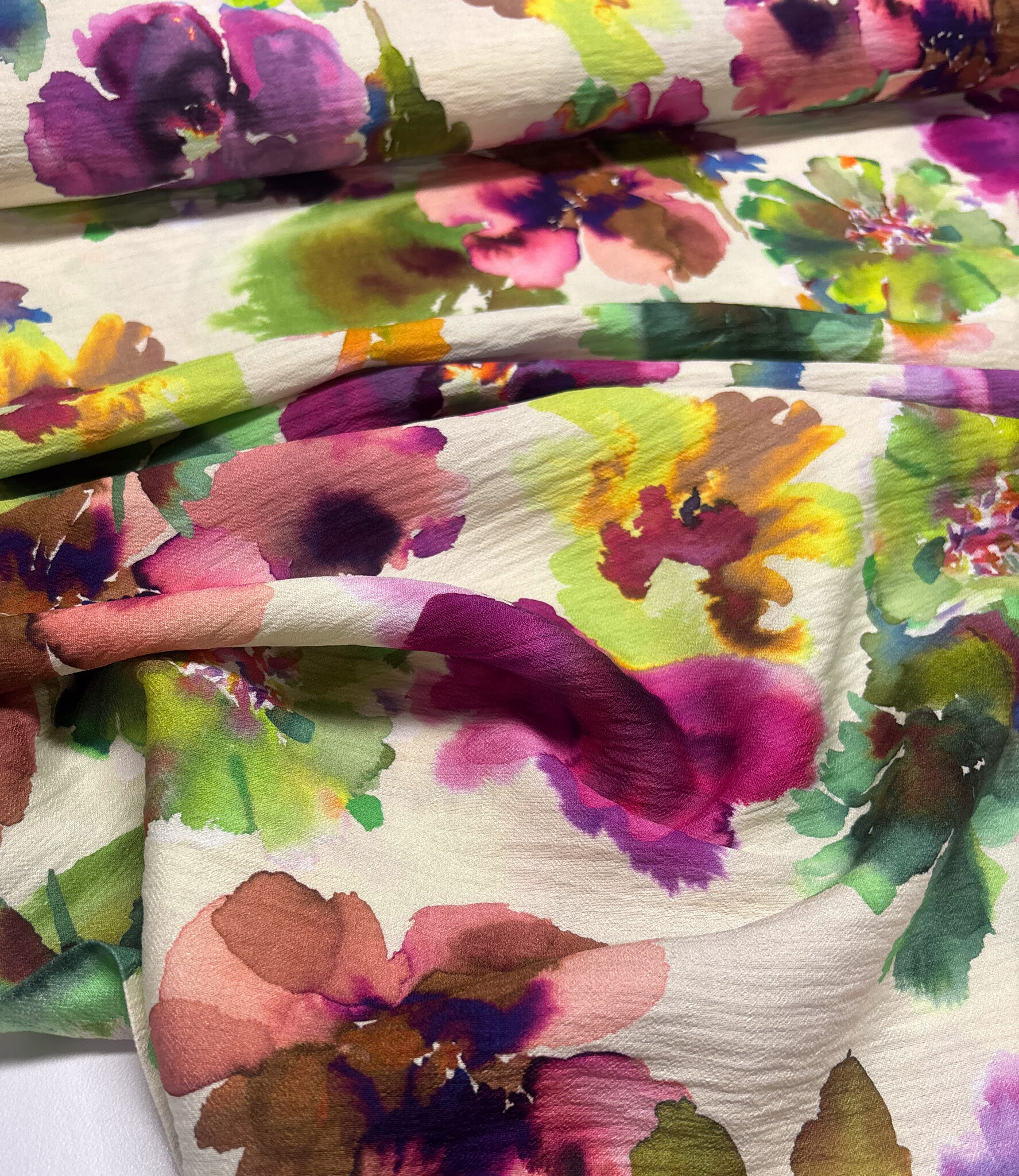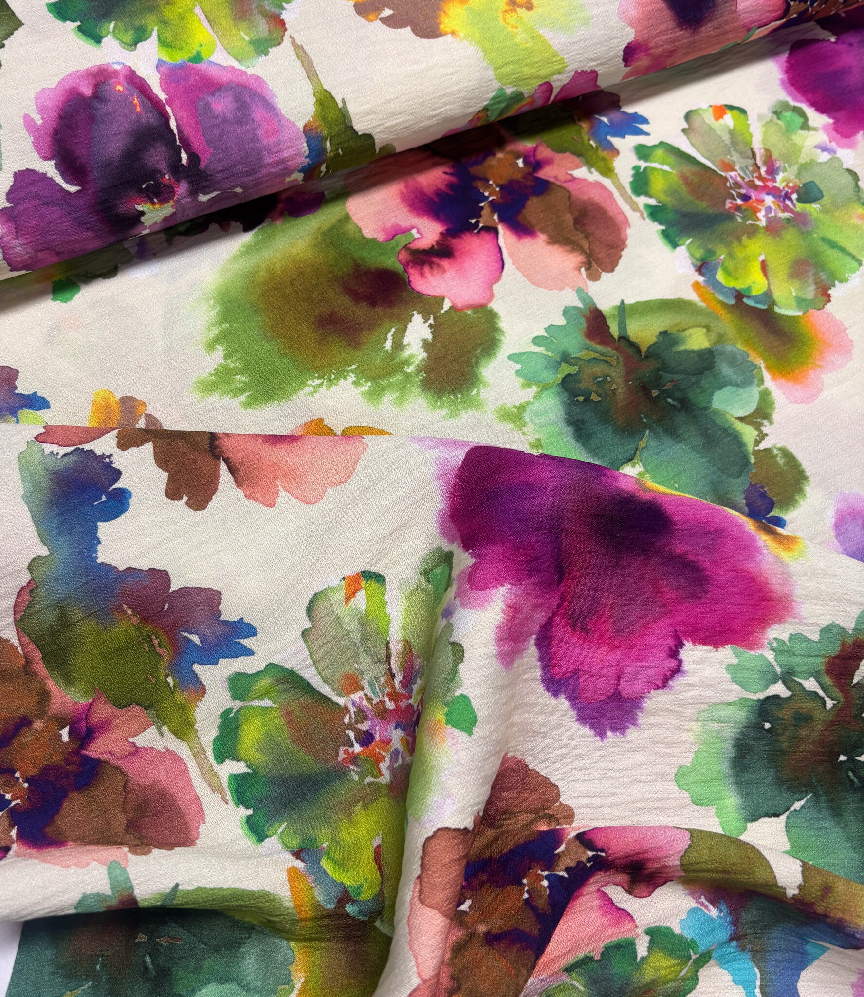Een prachtige viscose slub (mooie textuur) met waterkleurige bloemen. A la Ville stoffen. Deze stof wordt gebruikt in het Knipmode magazine.