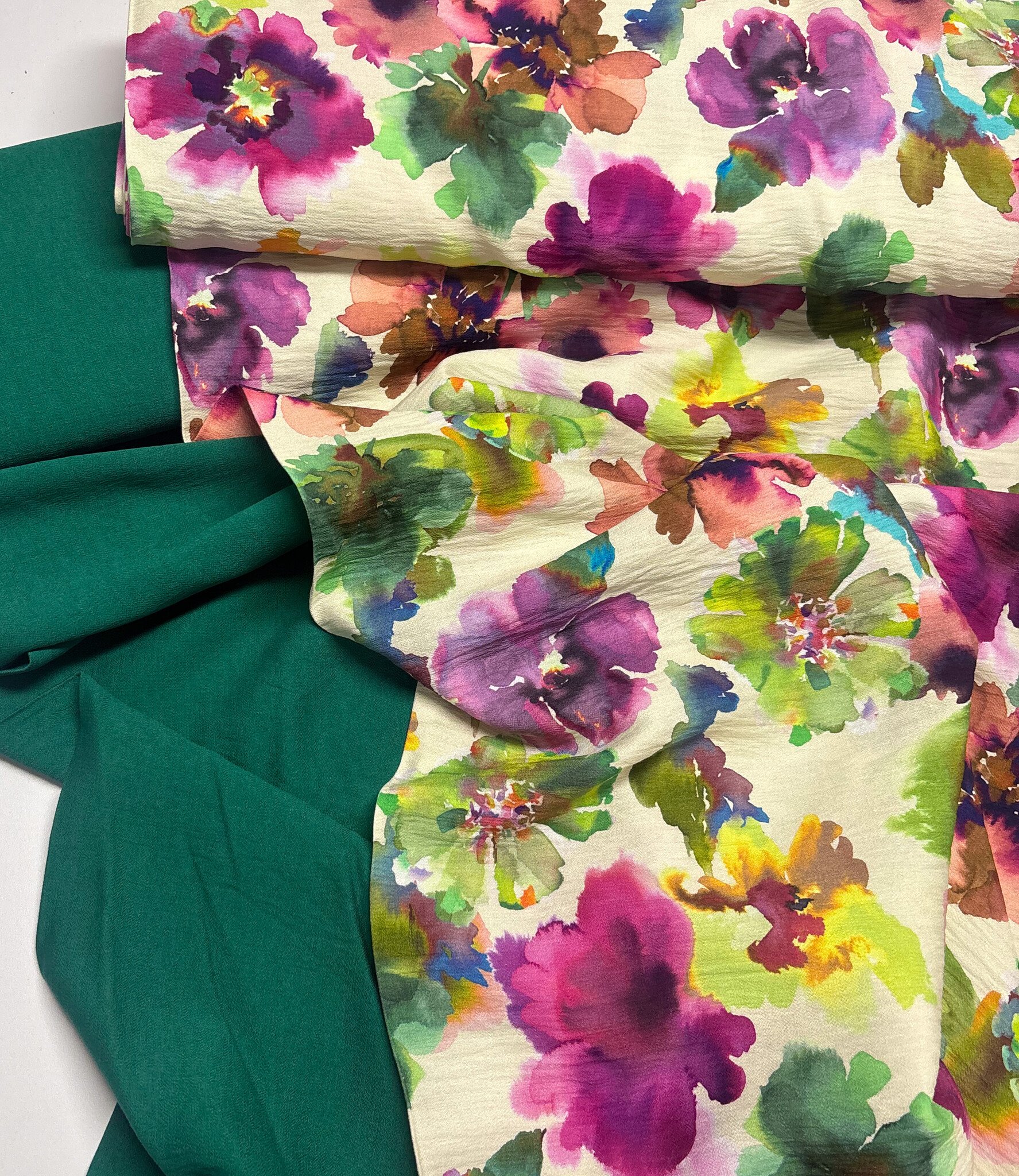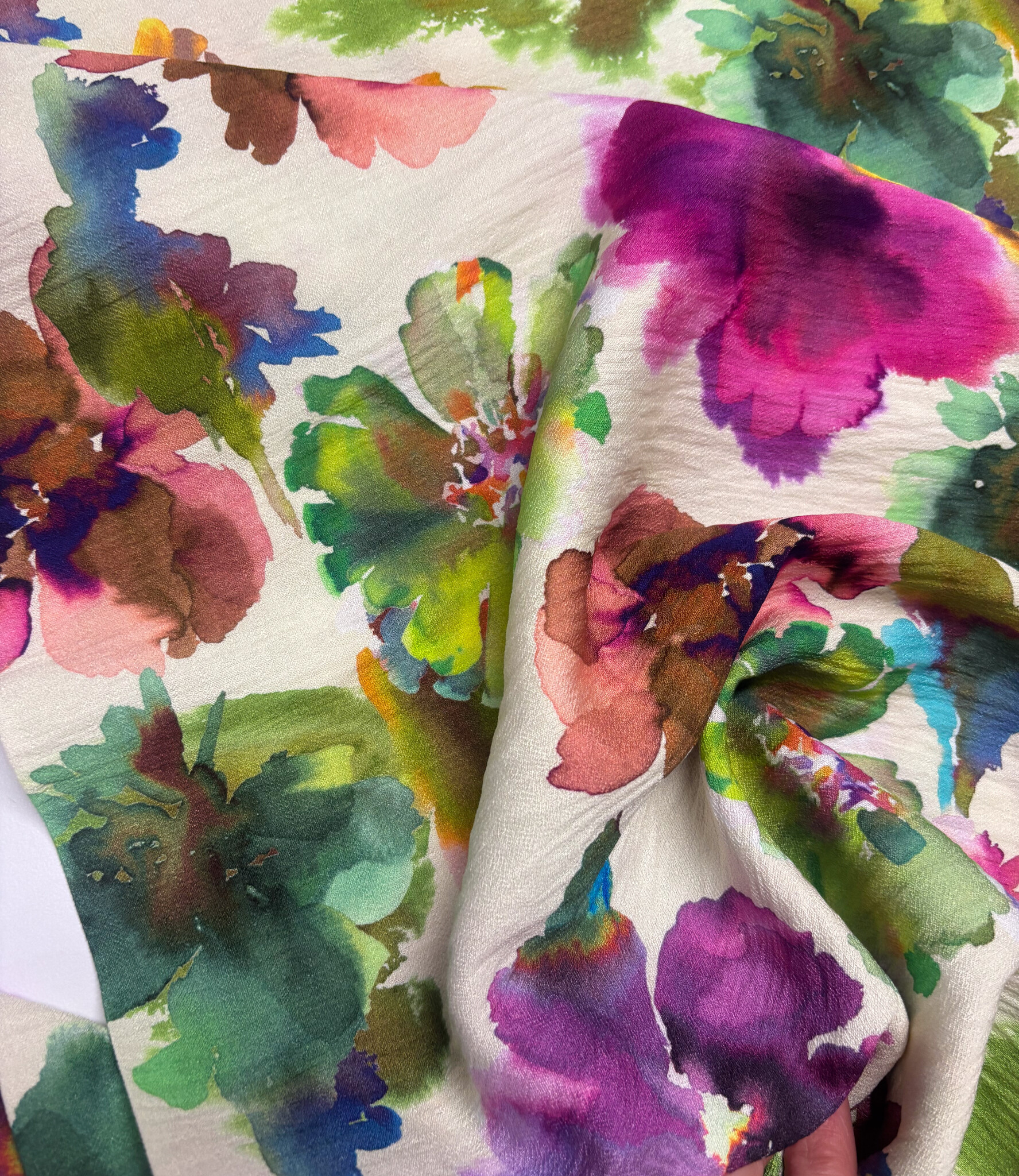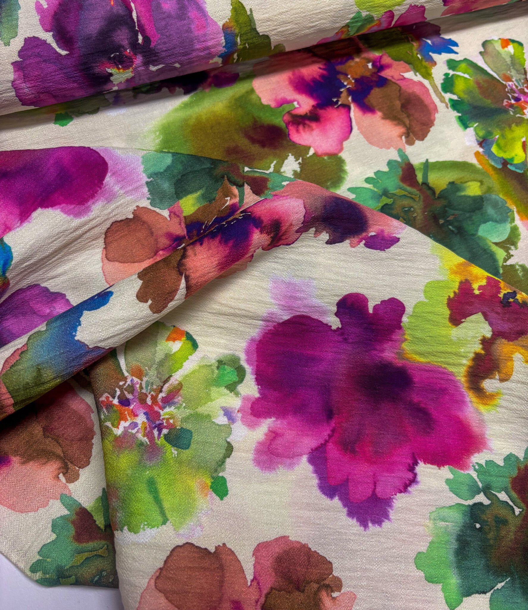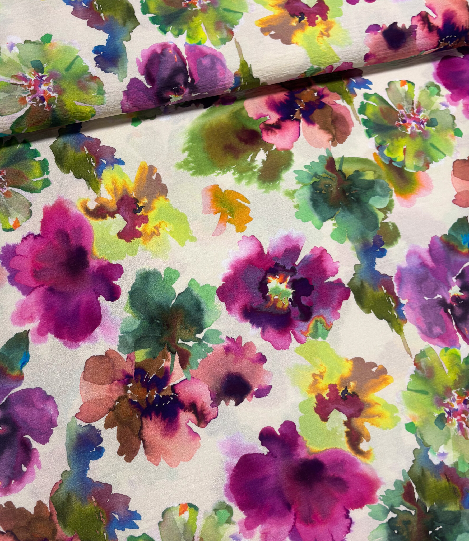 Een prachtige viscose slub (mooie textuur) met waterkleurige bloemen. A la Ville stoffen. Deze stof wordt gebruikt in het Knipmode magazine.