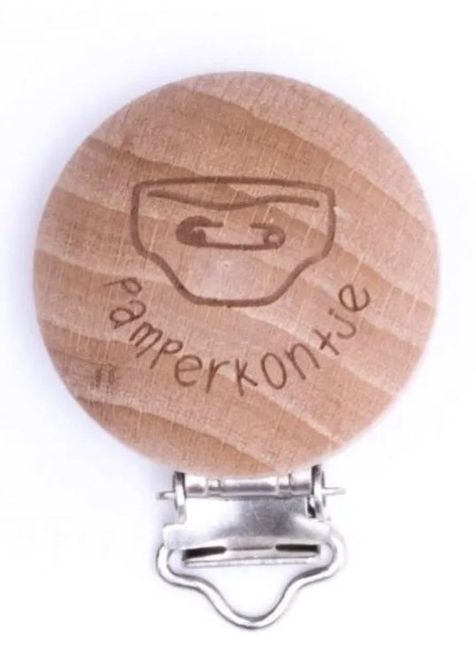 Een schattige fopspeenklem van glad hout met tekst "Pamperkontje".