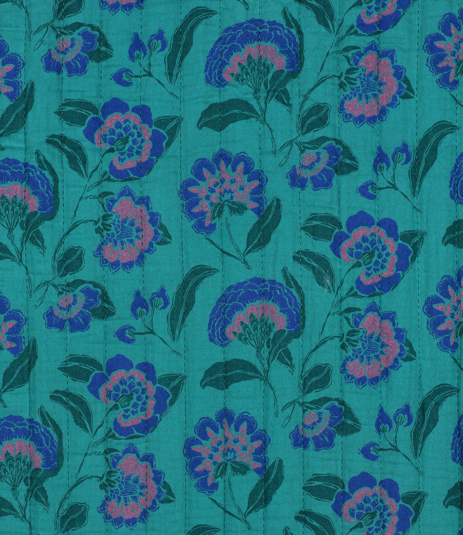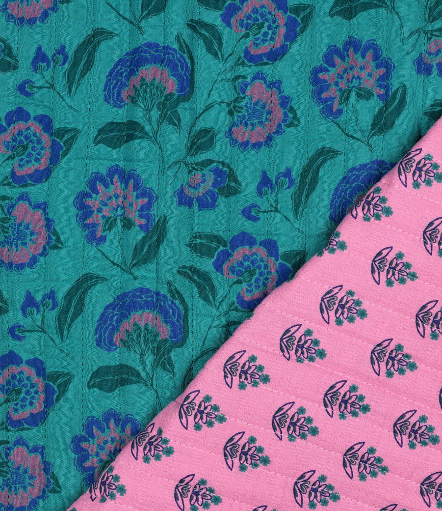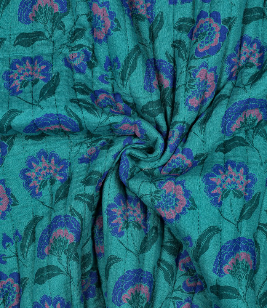 Een zachte gewatteerde tweezijdige double gauze tetra met prachtige bloemenprint. Double face, dus deze stof is bruikbaar langs beide kanten.