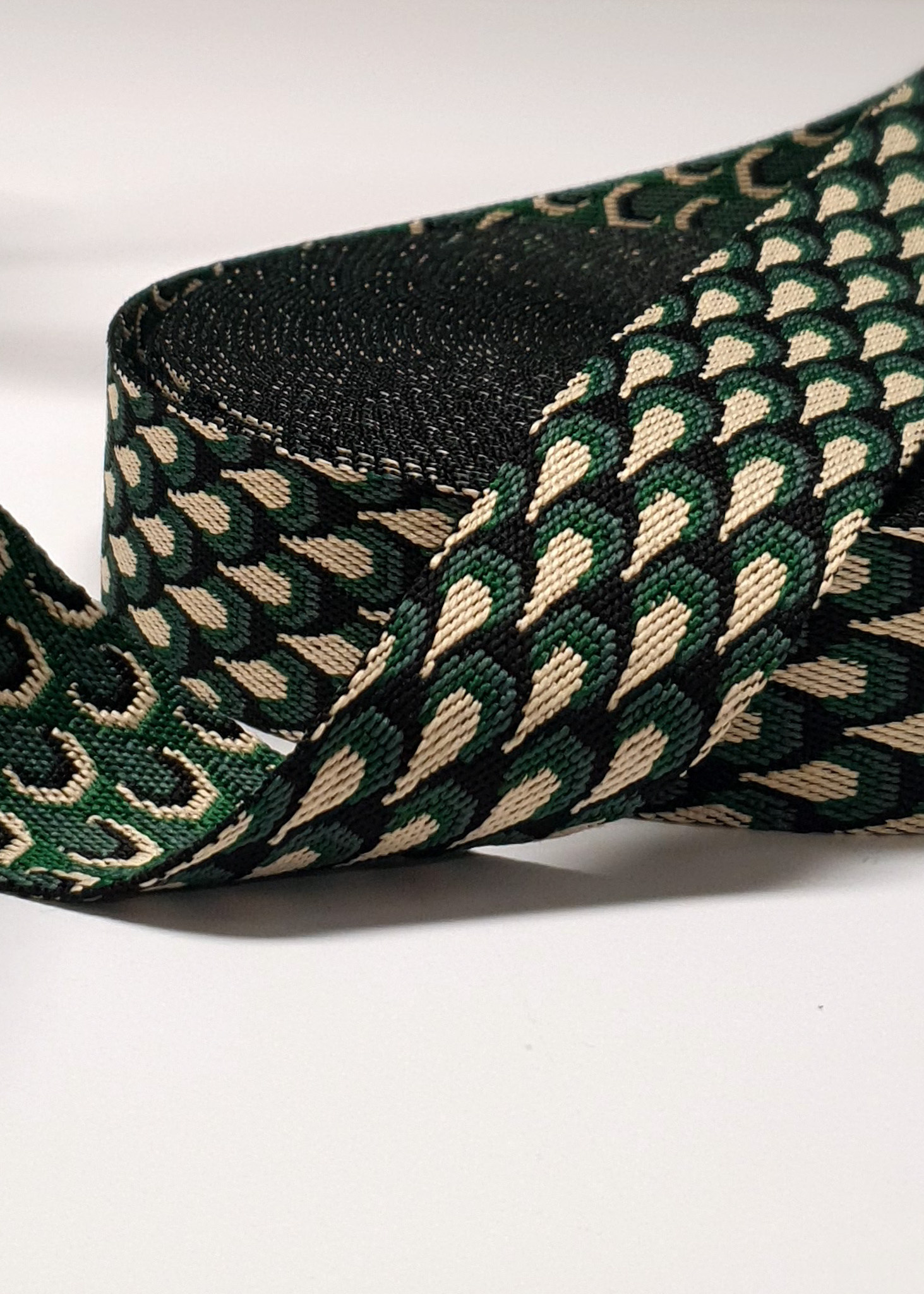 petrol en zwart retro pauw - tassenband 38 mm - Madeline de stoffenmadam - Stoffenwinkel Lier ( Antwerpen )