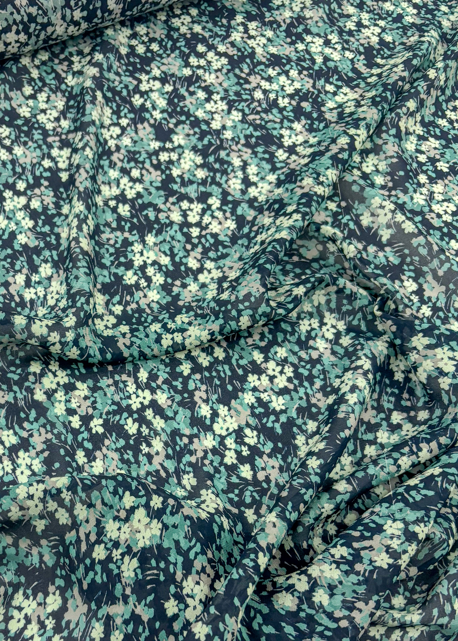 Prachtige voile met petrolkleurige bloemetjes. Ideaal voor een bloesje of een kleedje, mits je het voert. Wij maakten er ook een prachtige kimono in, heel mooi overdag, maar ook op het strand, of in je slaapkamer. :-)