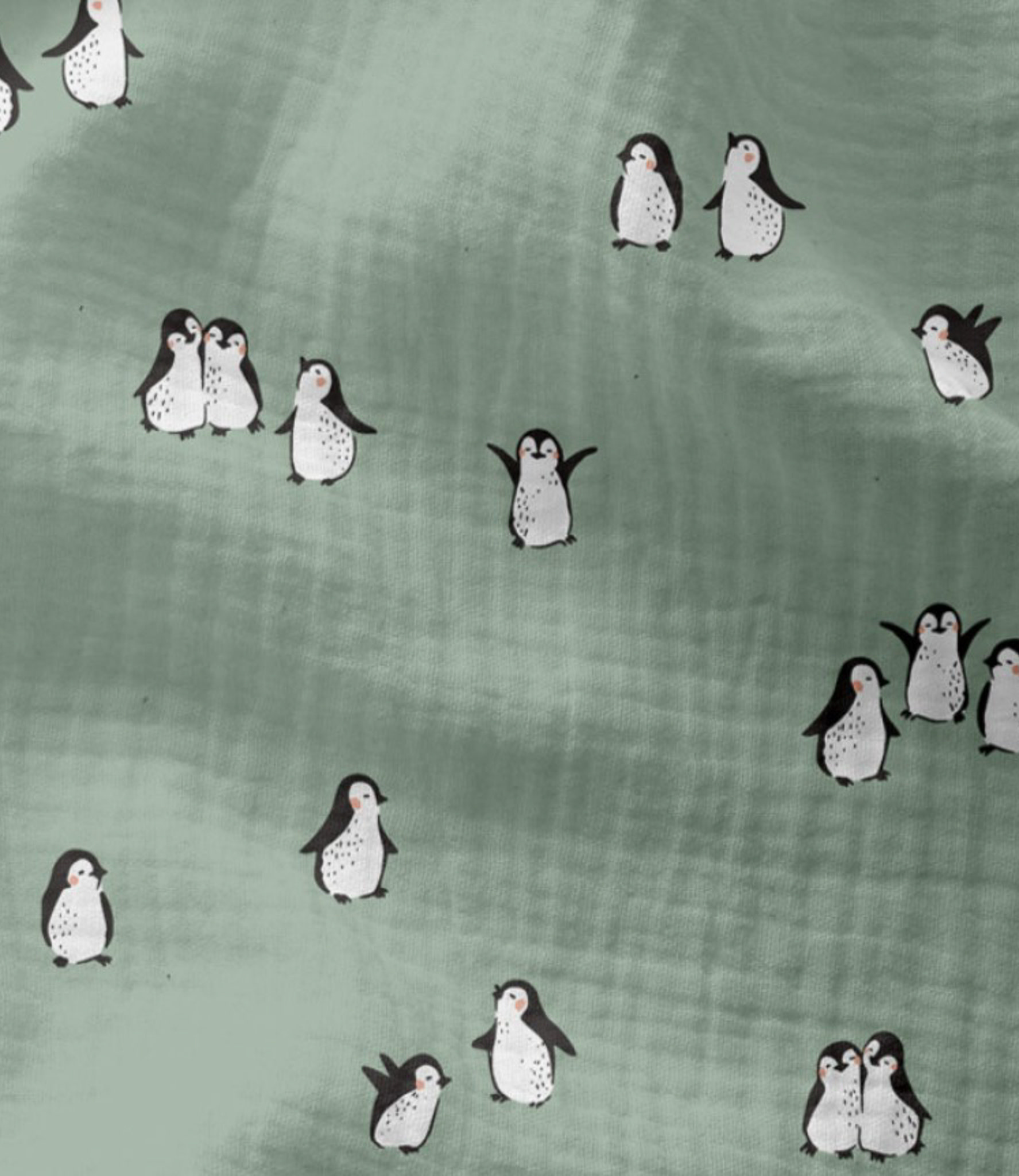 Mooie kwaliteit double gauze met pinguins. Perfect voor kleedjes, tops, T-shirts en voor baby- en kinderspulletjes (babynestje, dekentje, ...). Heerlijk zacht. OEKO-tex.