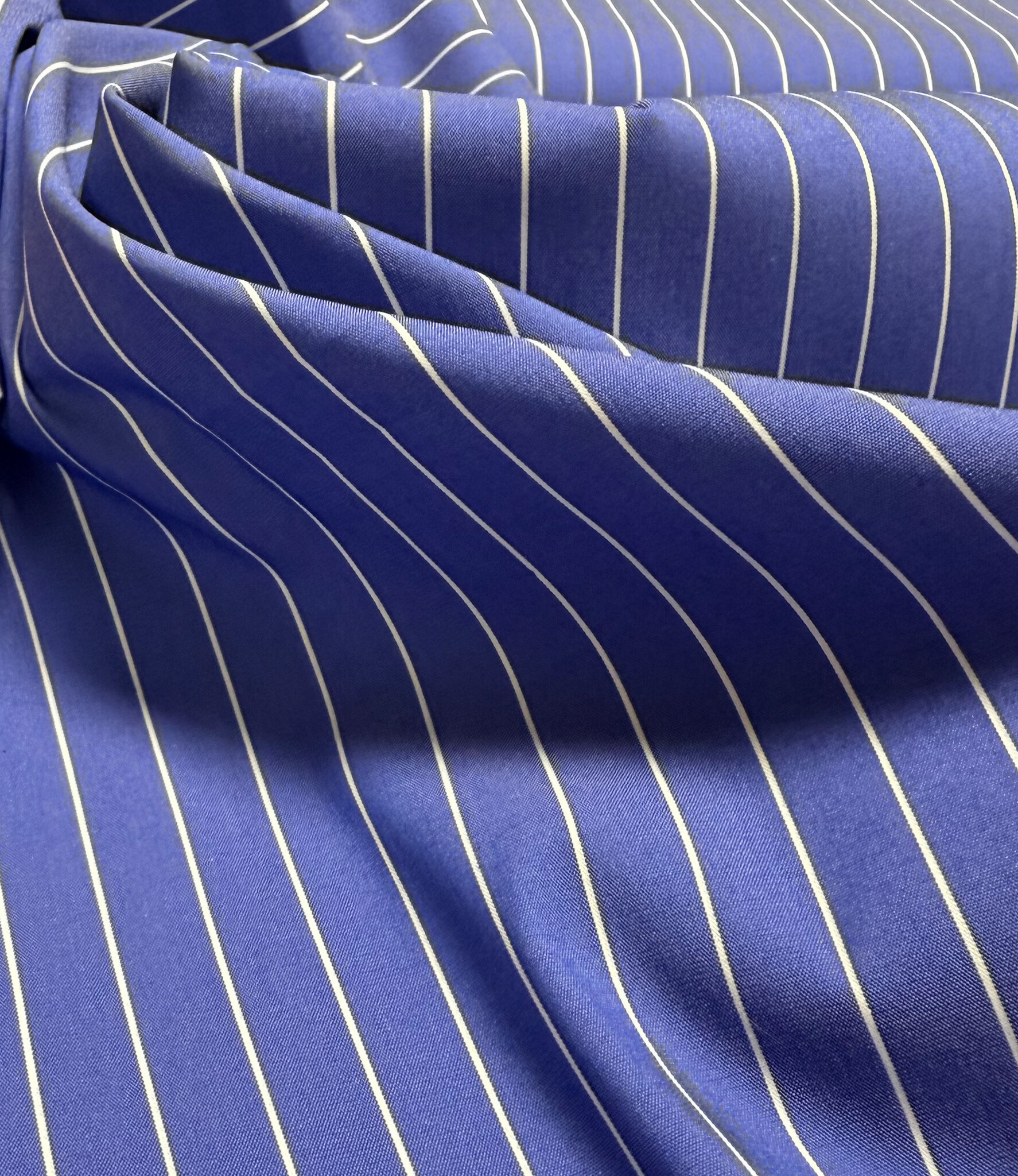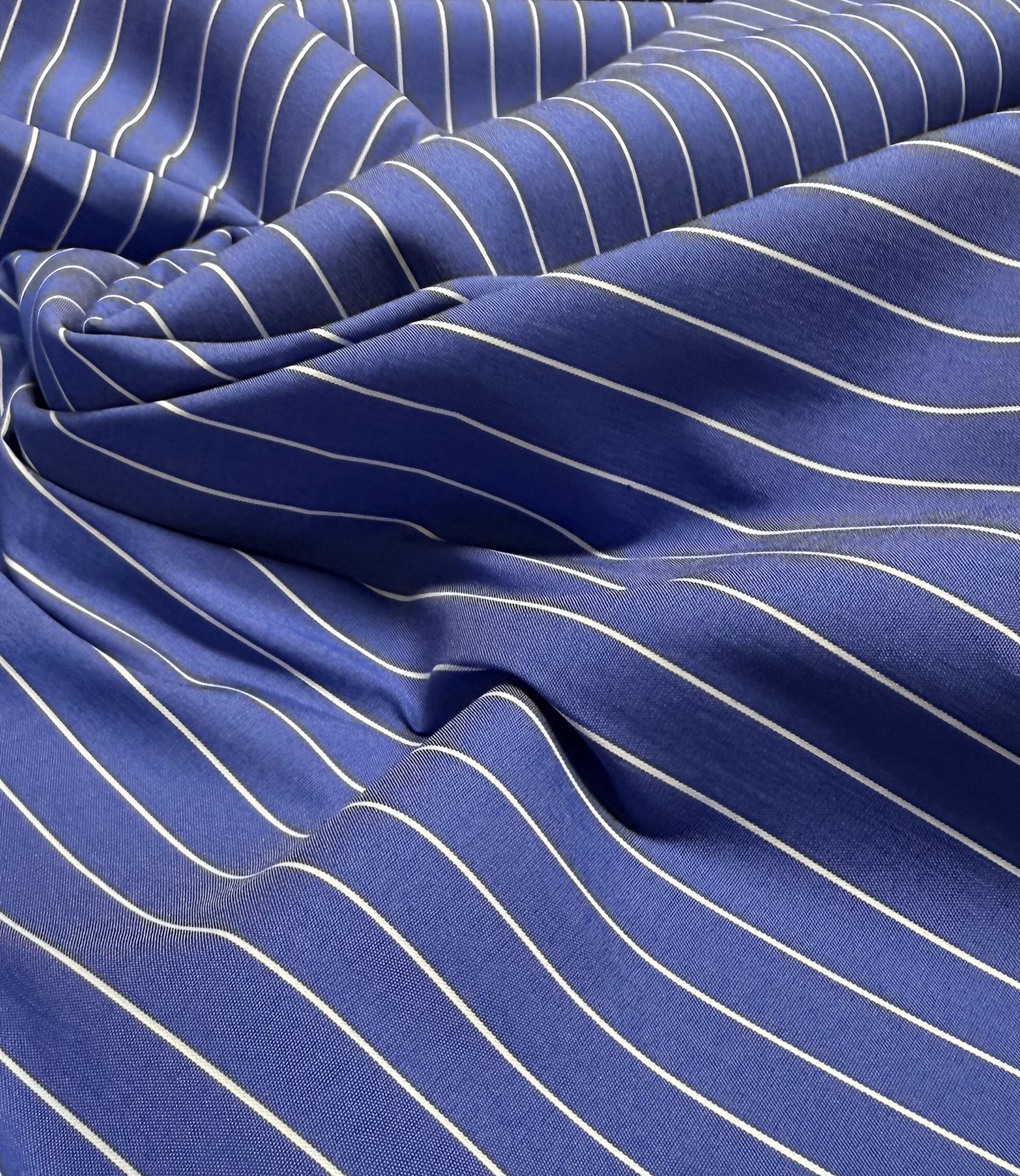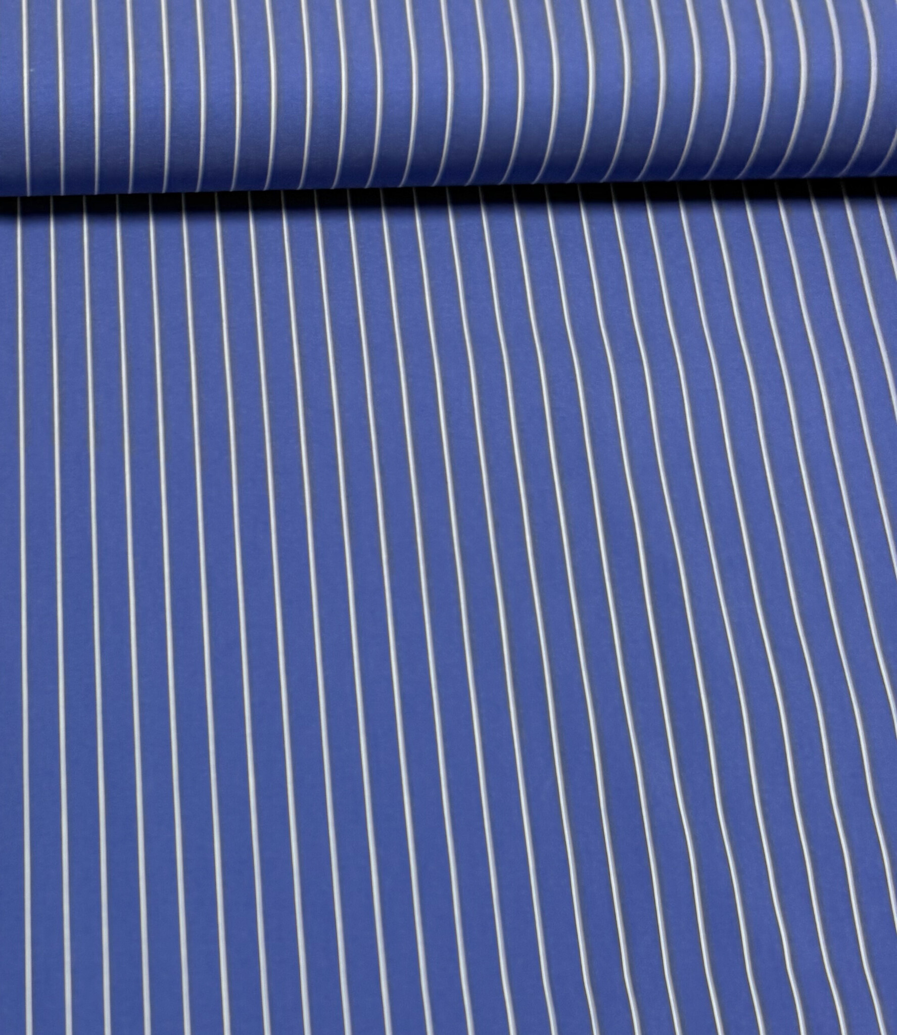 Een mooi doorkleurde en soepelvallende poplin katoen met strepen en een klein beetje rek voor draagcomfort. Door de aanwezigheid van een beetje polyester in deze stof kreukt ze heel weinig. Deze stof kan gebruikt worden voor blouses, hemden, kleedjes, lange rokken, ...