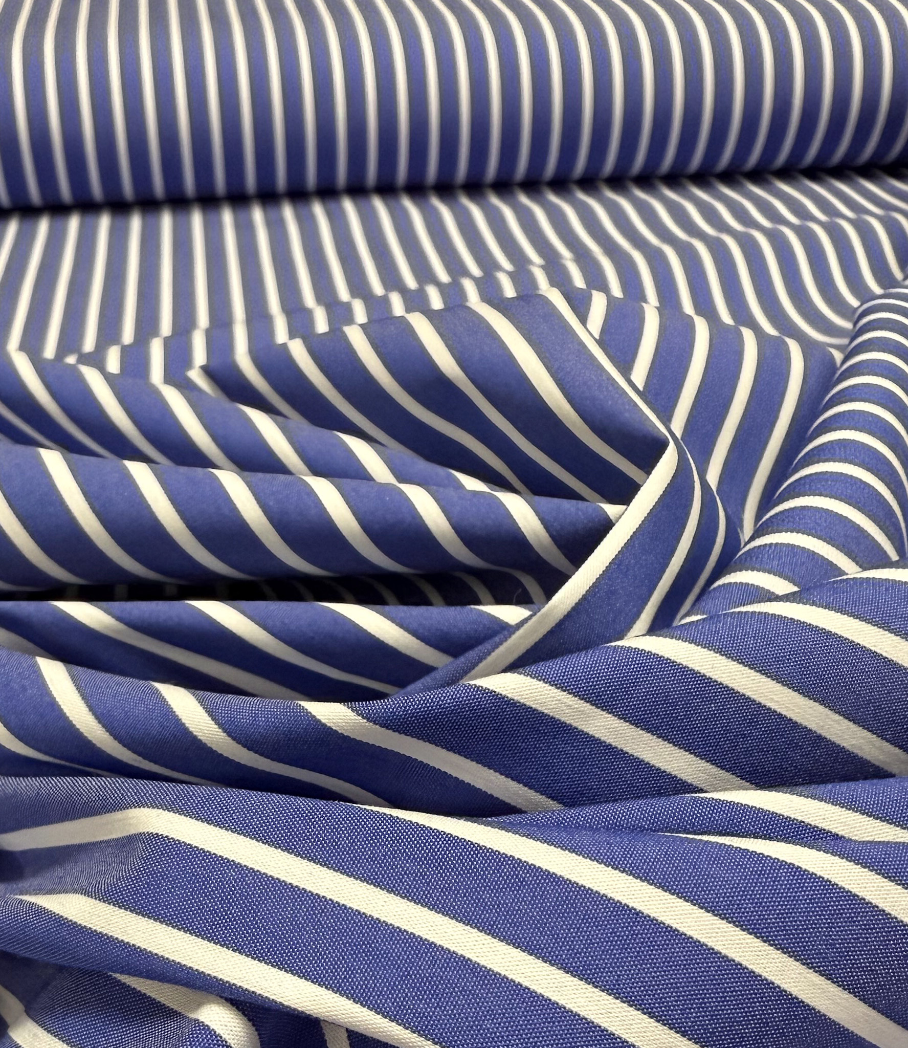 Een mooi doorkleurde en soepelvallende poplin katoen met strepen en een klein beetje rek voor draagcomfort. Door de aanwezigheid van een beetje polyester in deze stof kreukt ze heel weinig. Deze stof kan gebruikt worden voor blouses, hemden, kleedjes, lange rokken, ...
