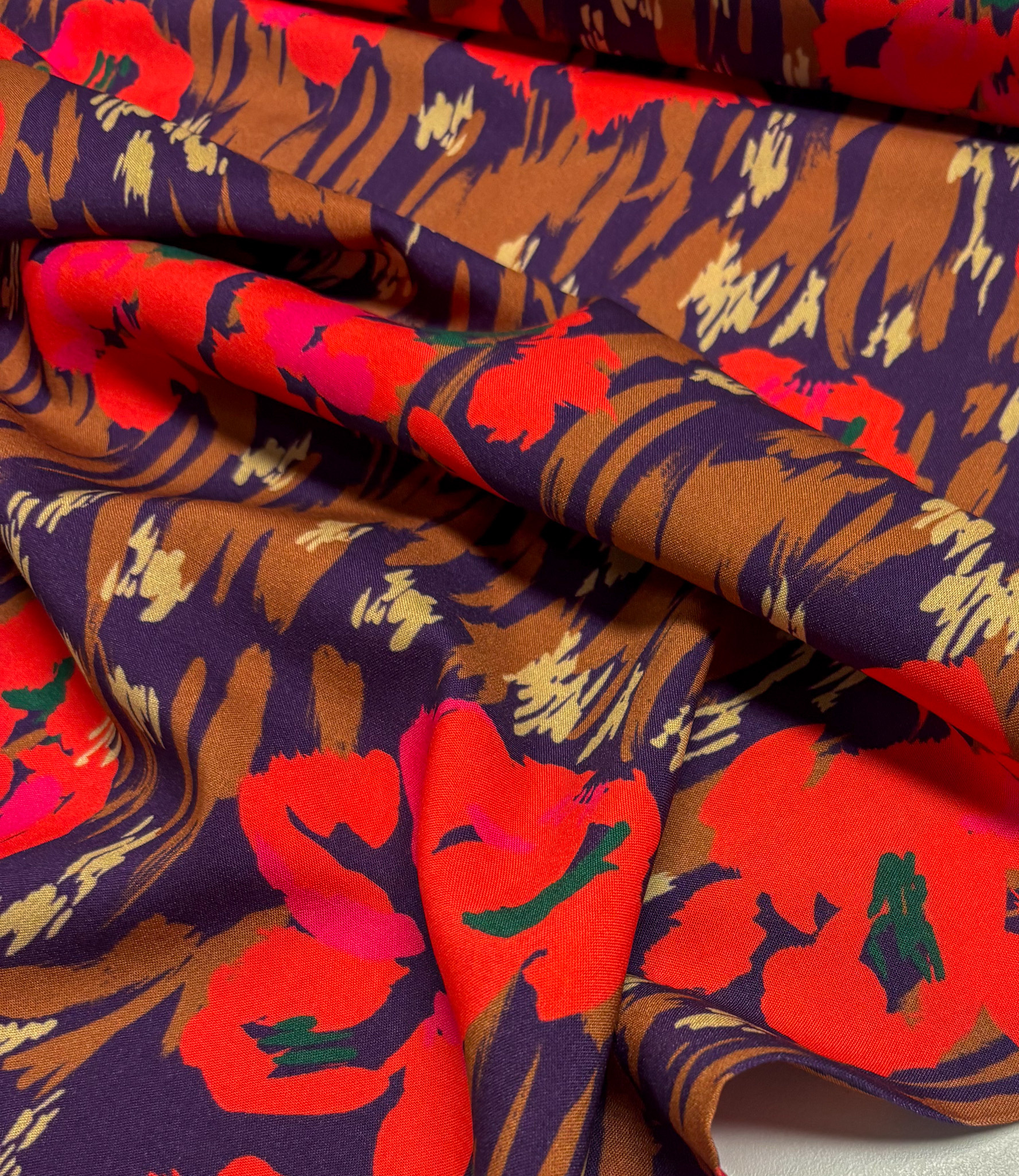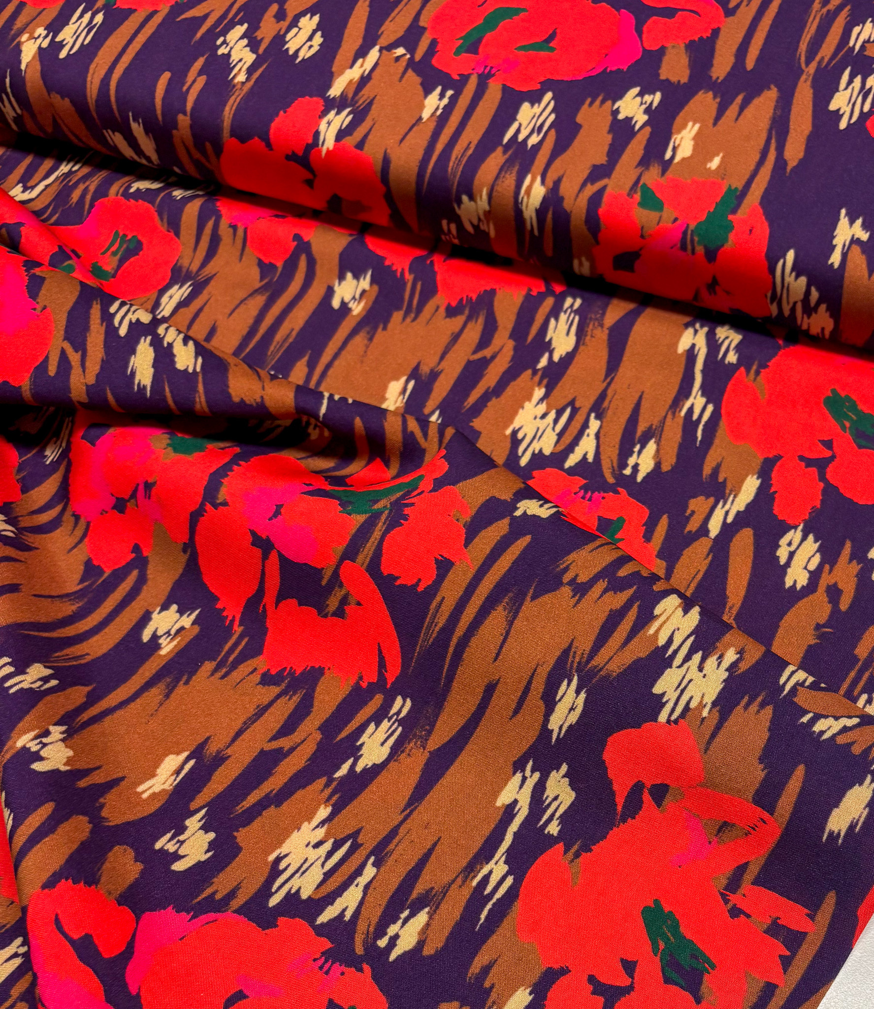 Een mooie luchtige viscose met rode bloemen. Perfect voor een blouse, jurk of soepelvallende losse broek.
