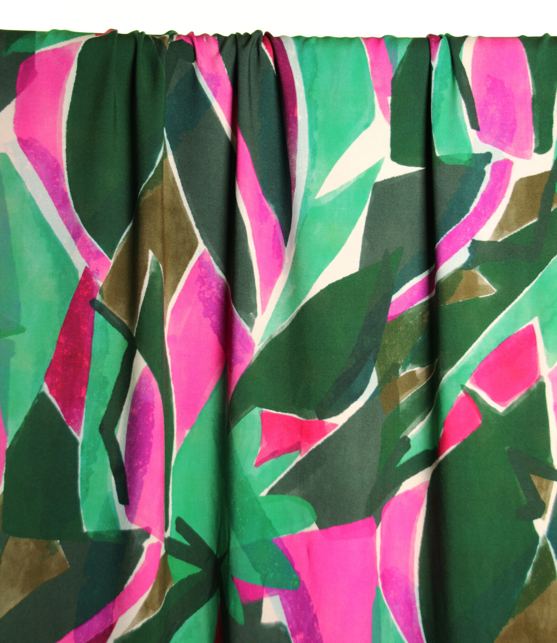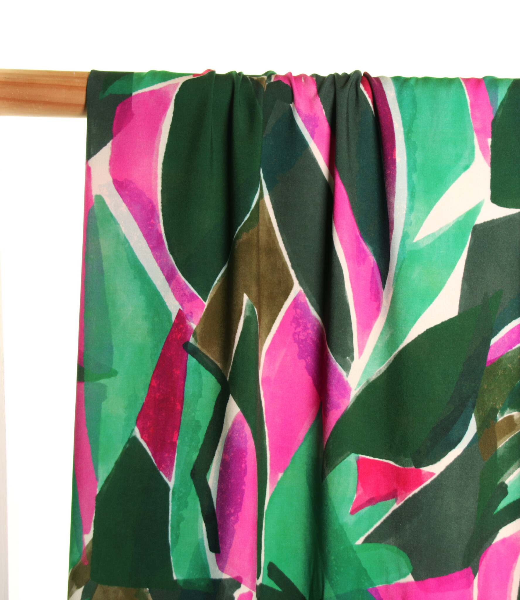 Een viscose met kleurrijke abstracte print van groene en roze bladeren op een witte achtergrond. Deze stof is geschikt voor blouses, jurken, rokken,...