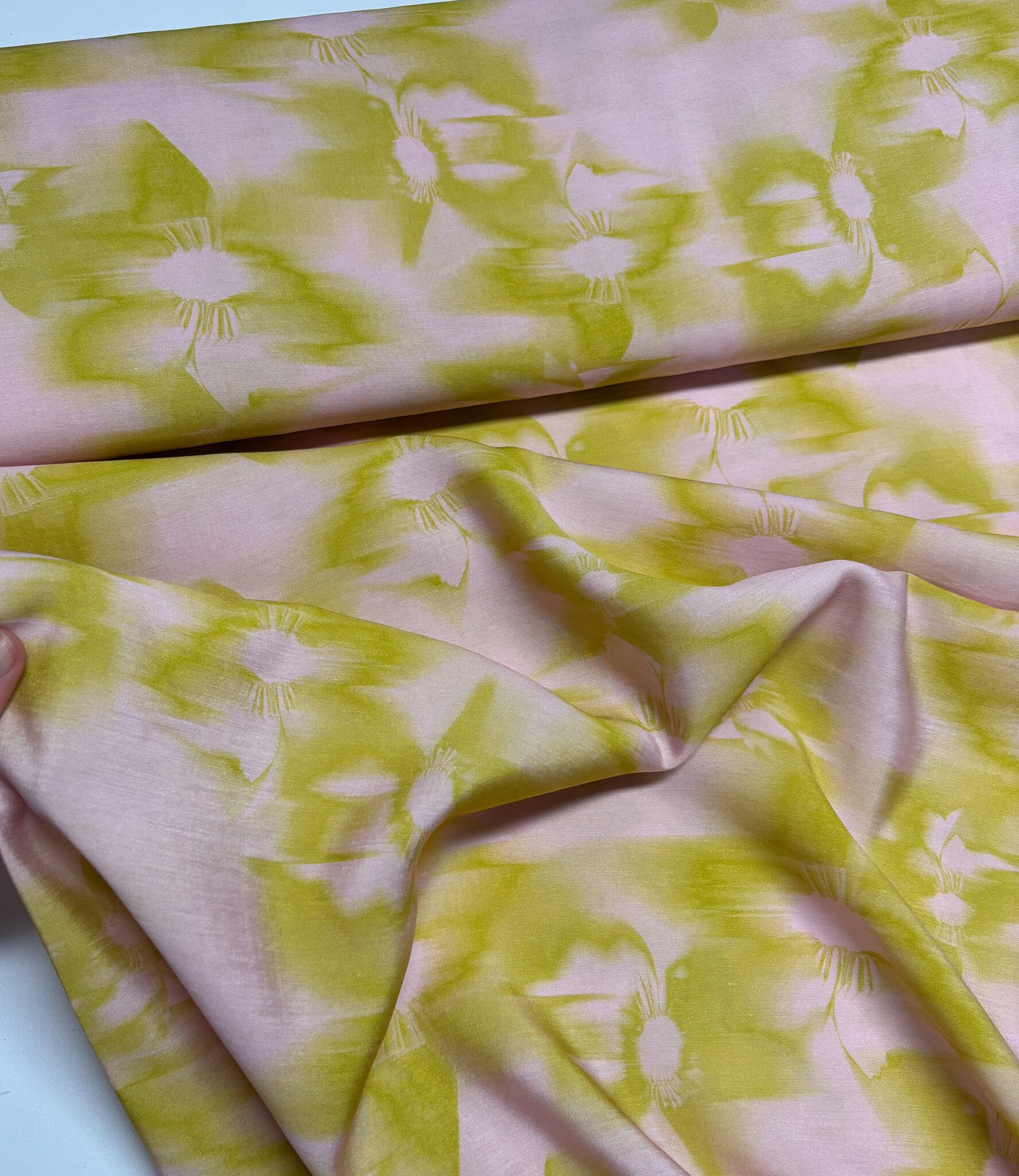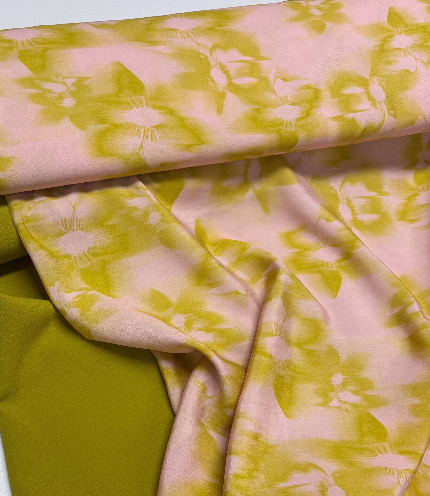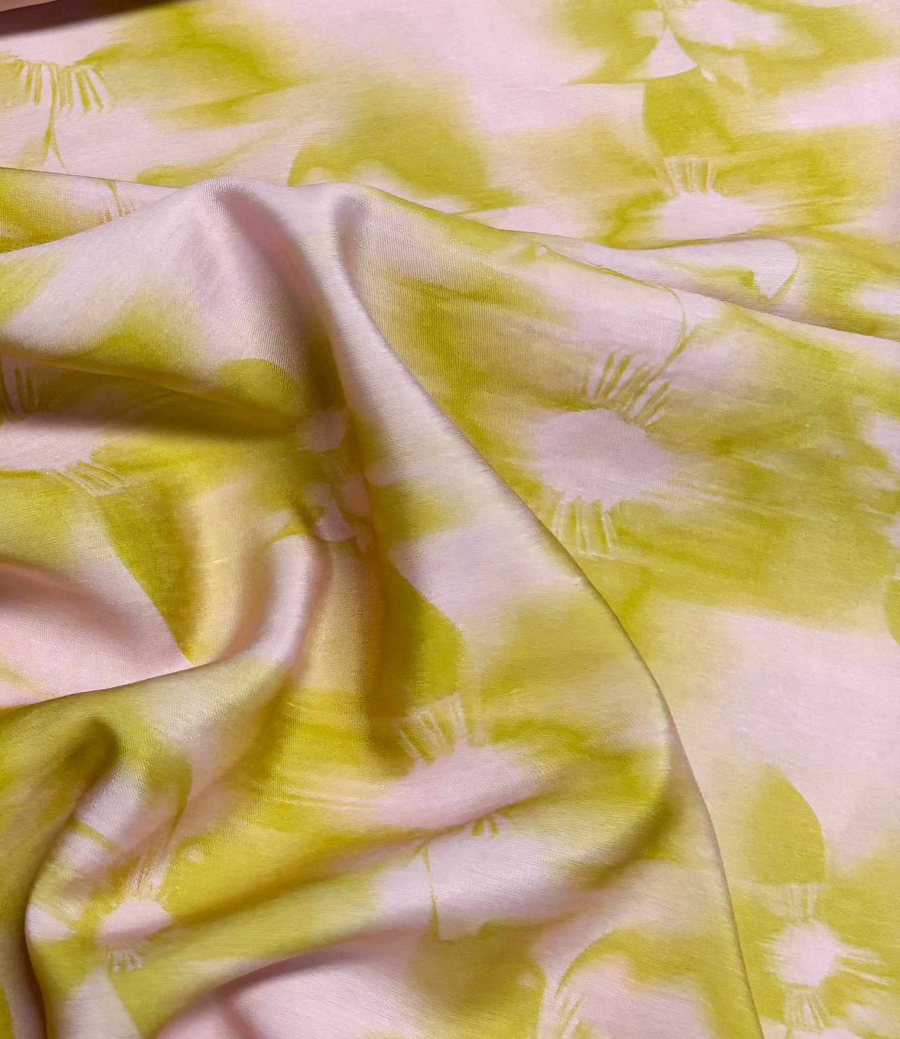 Een zijdezachte satijn viscose met okerkleurige subtiele bloemen.