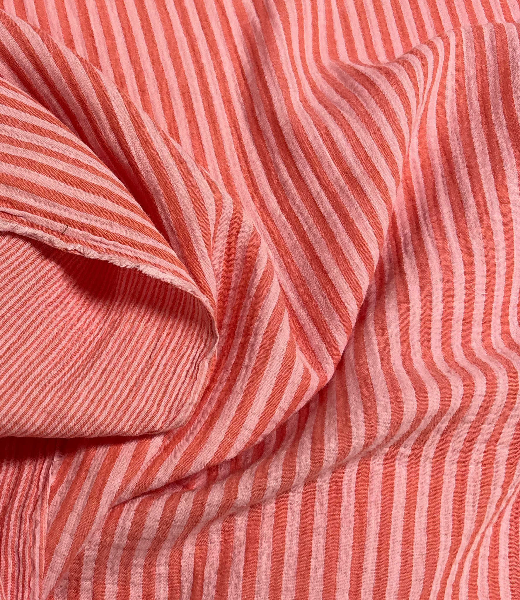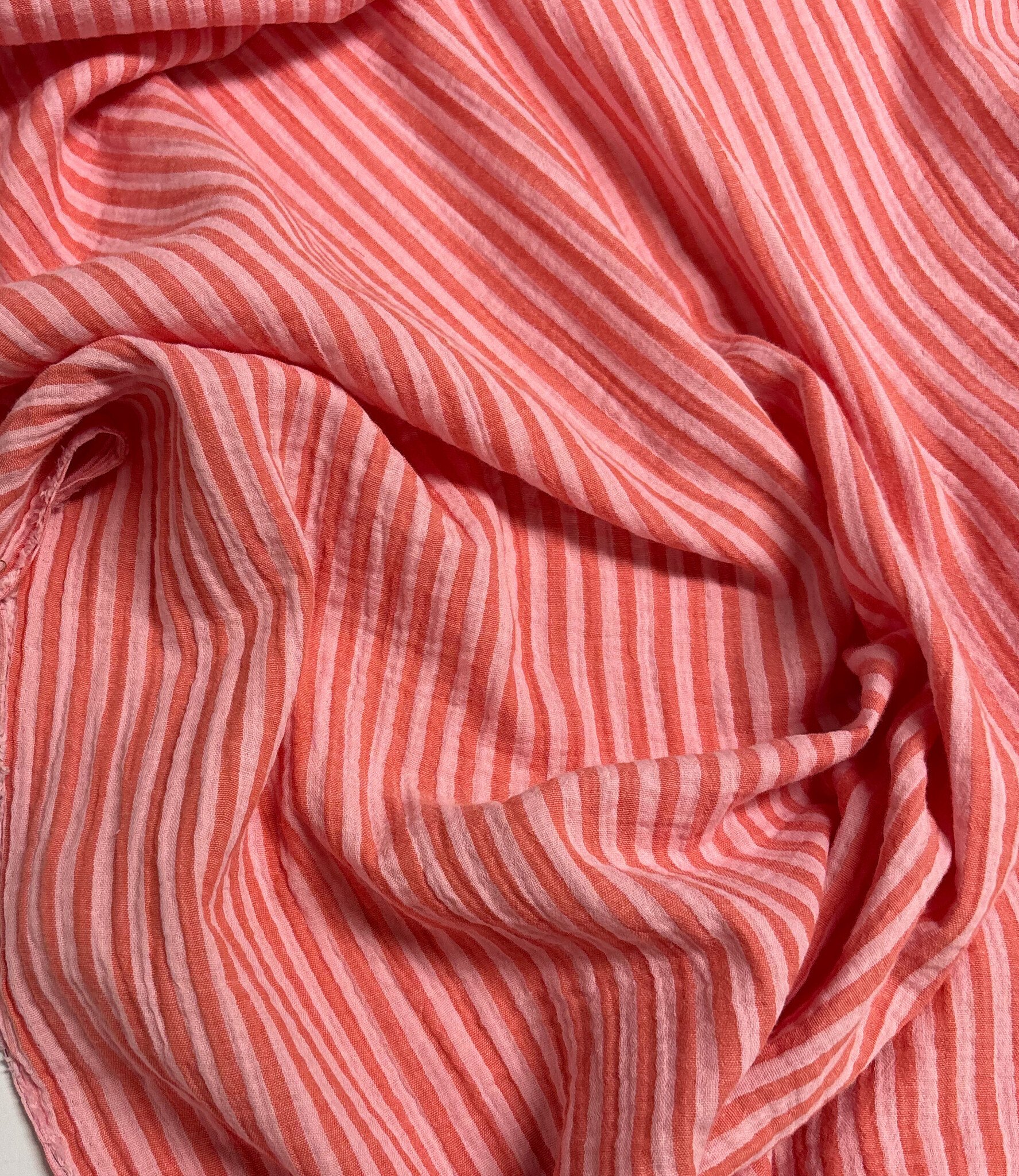 Een hele mooie en zachte tetra stof met strepen langs beide kanten. Aan de ene zijde heeft de stof iets bredere strepen, aan de andere kant zijn er fijne streepjes.