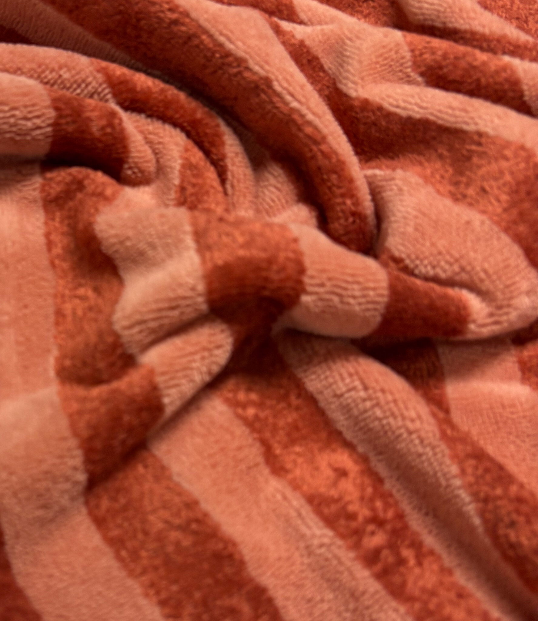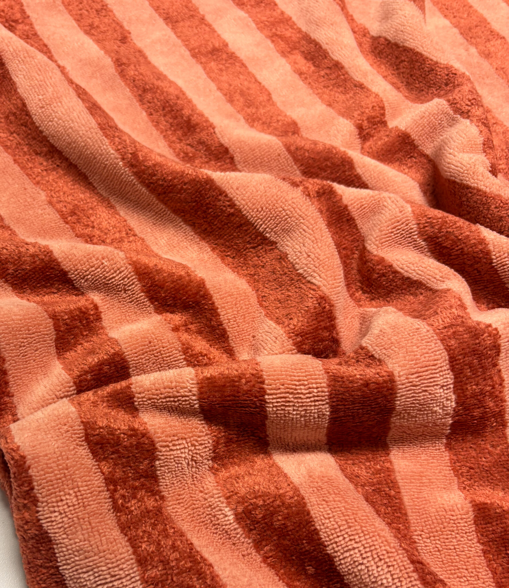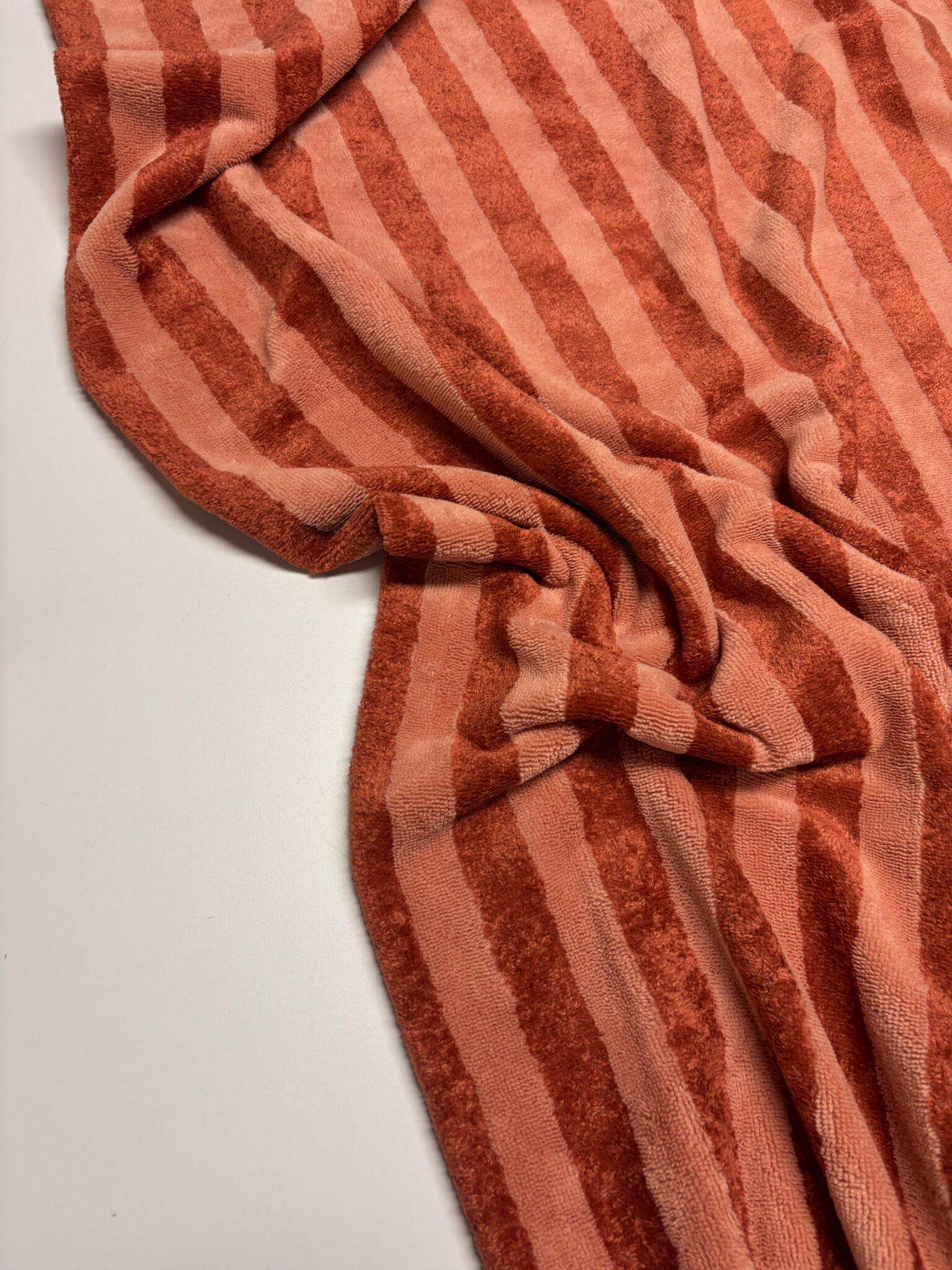 Mooie kwaliteit badstof met aan de ene kant strepen, aan de andere kant een effen kleur. Leuk voor: badjassen, handdoeken, strandtassen, toiletzakken, shorts, badcapes...  Heerlijk zacht. OEKO TEX.