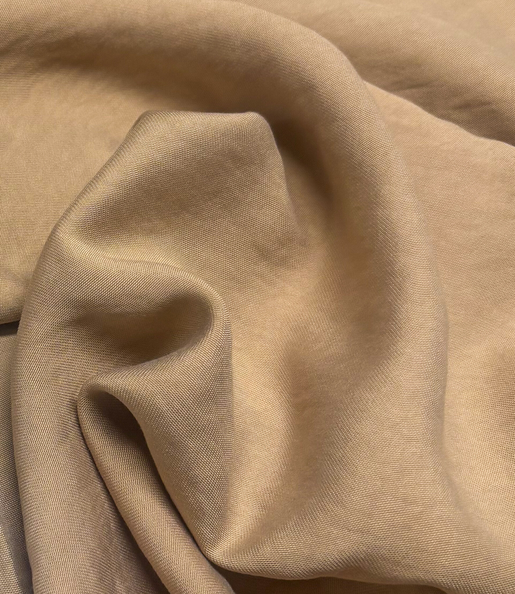 Een effen viscose twill. Deze valt goed door en kreukt niet.