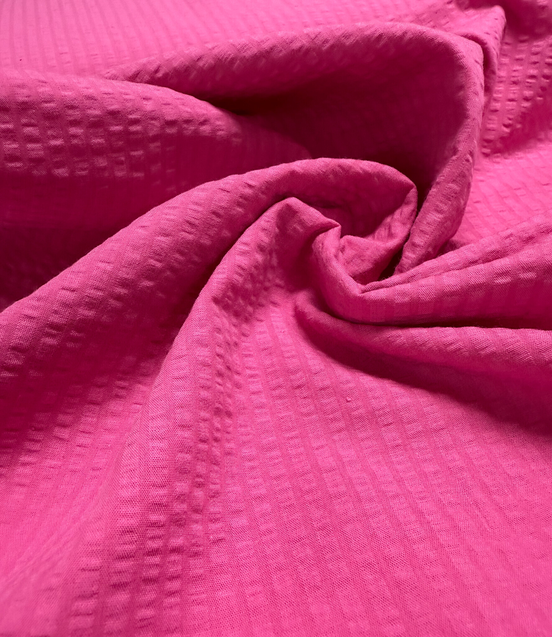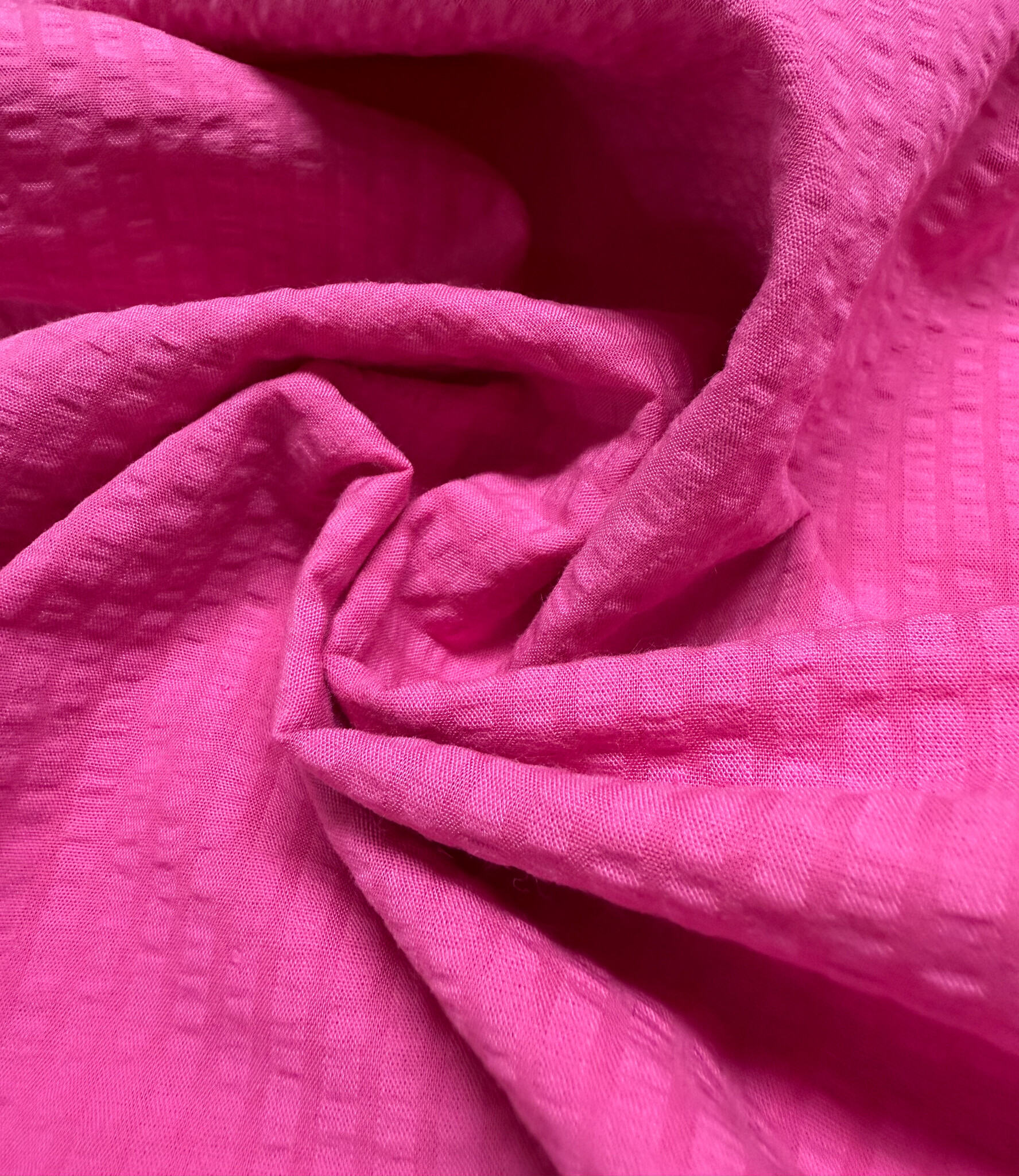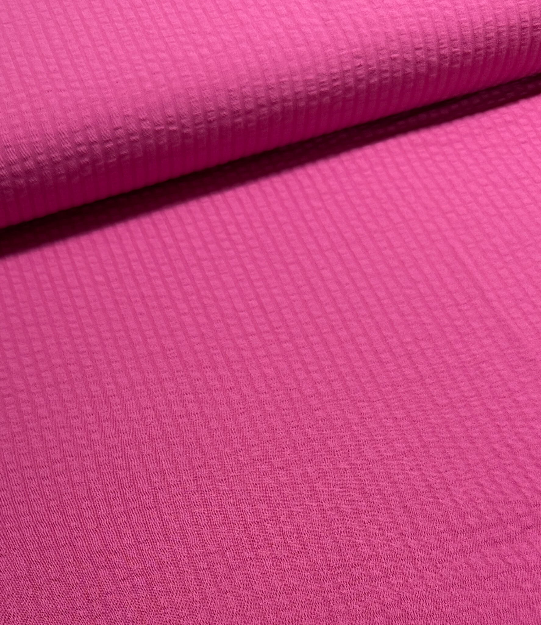 Een toffe gestreepte seersucker in fuchsia. Oeko-Tex. Perfect voor luchtige bloesjes, rokken en jurken.