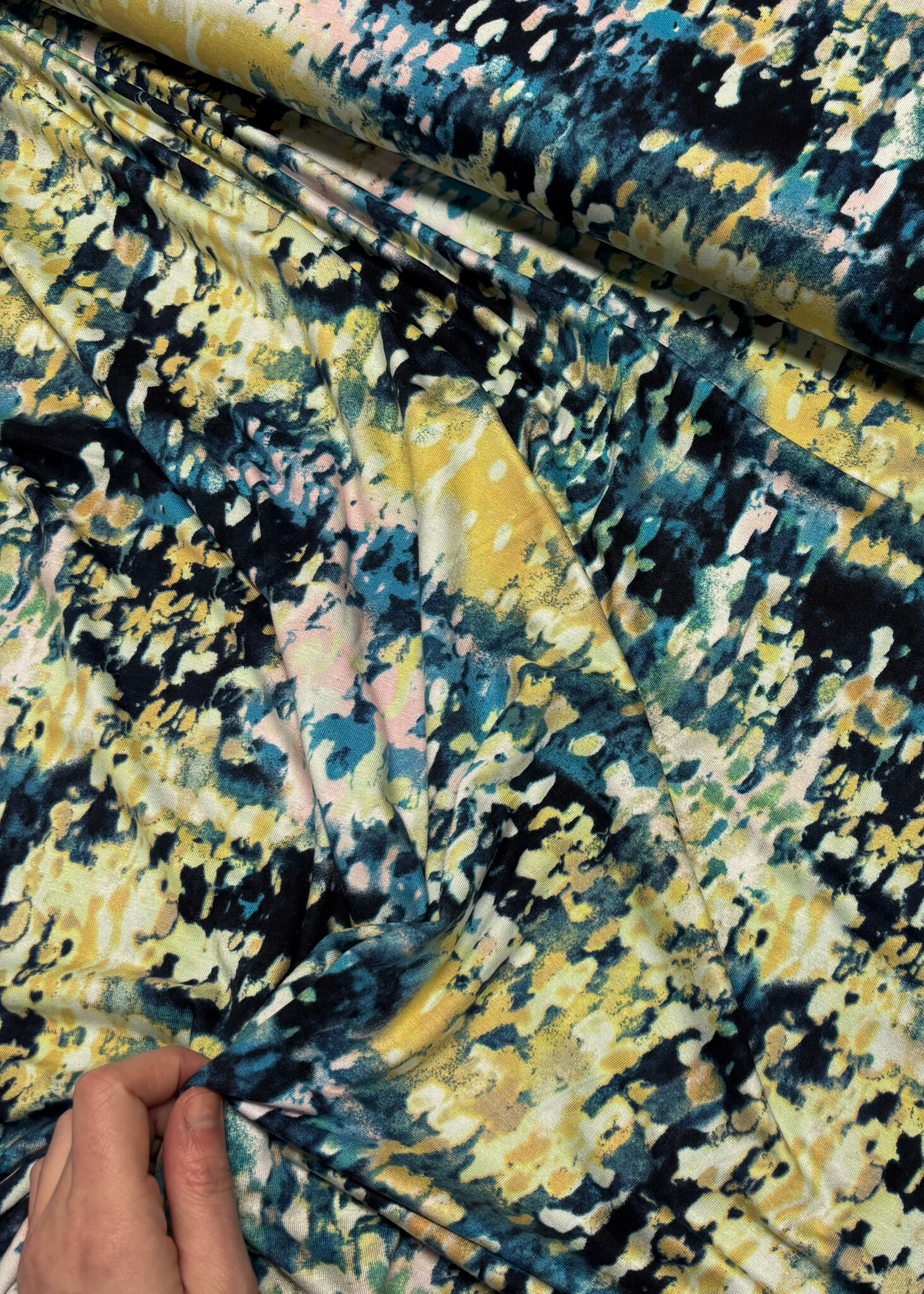 Een fijn viscose tricot met blauwe tinten. OEKO TEX. Zachte en soepelvallende stof, zeer geschikt voor T-shirts en sportieve jurken voor dames.