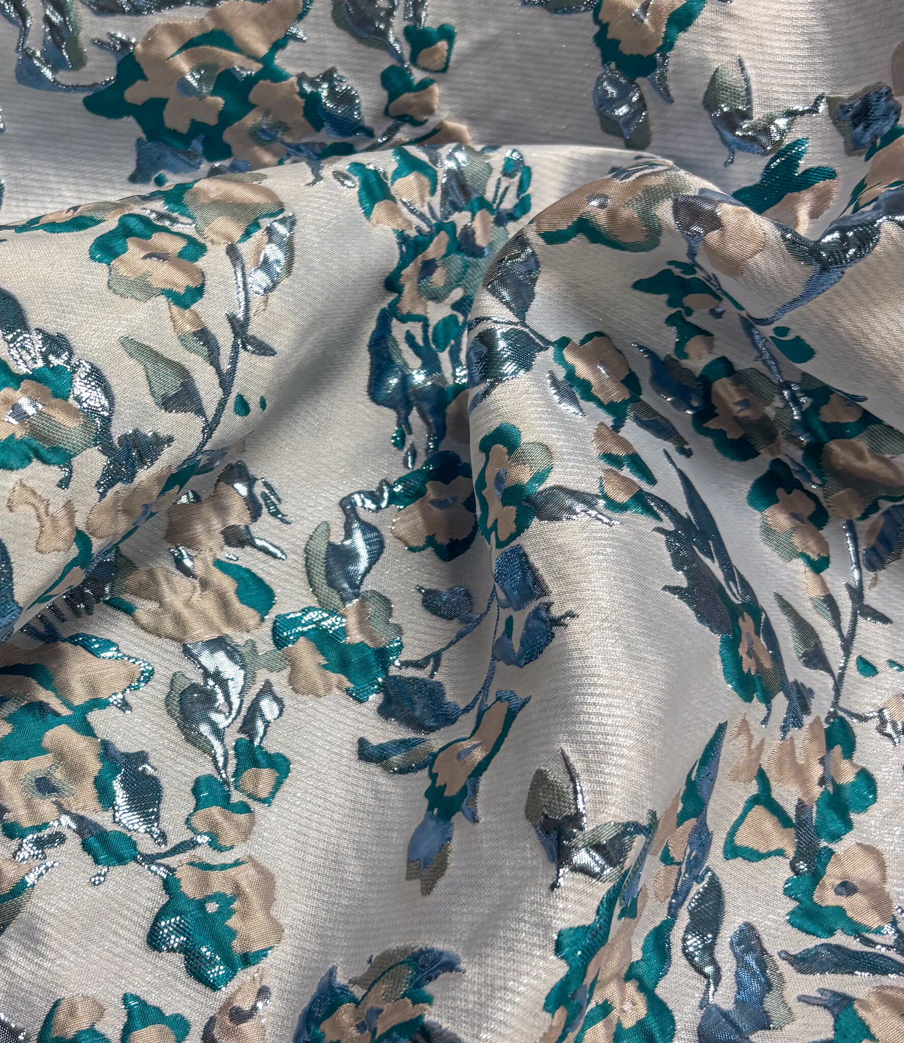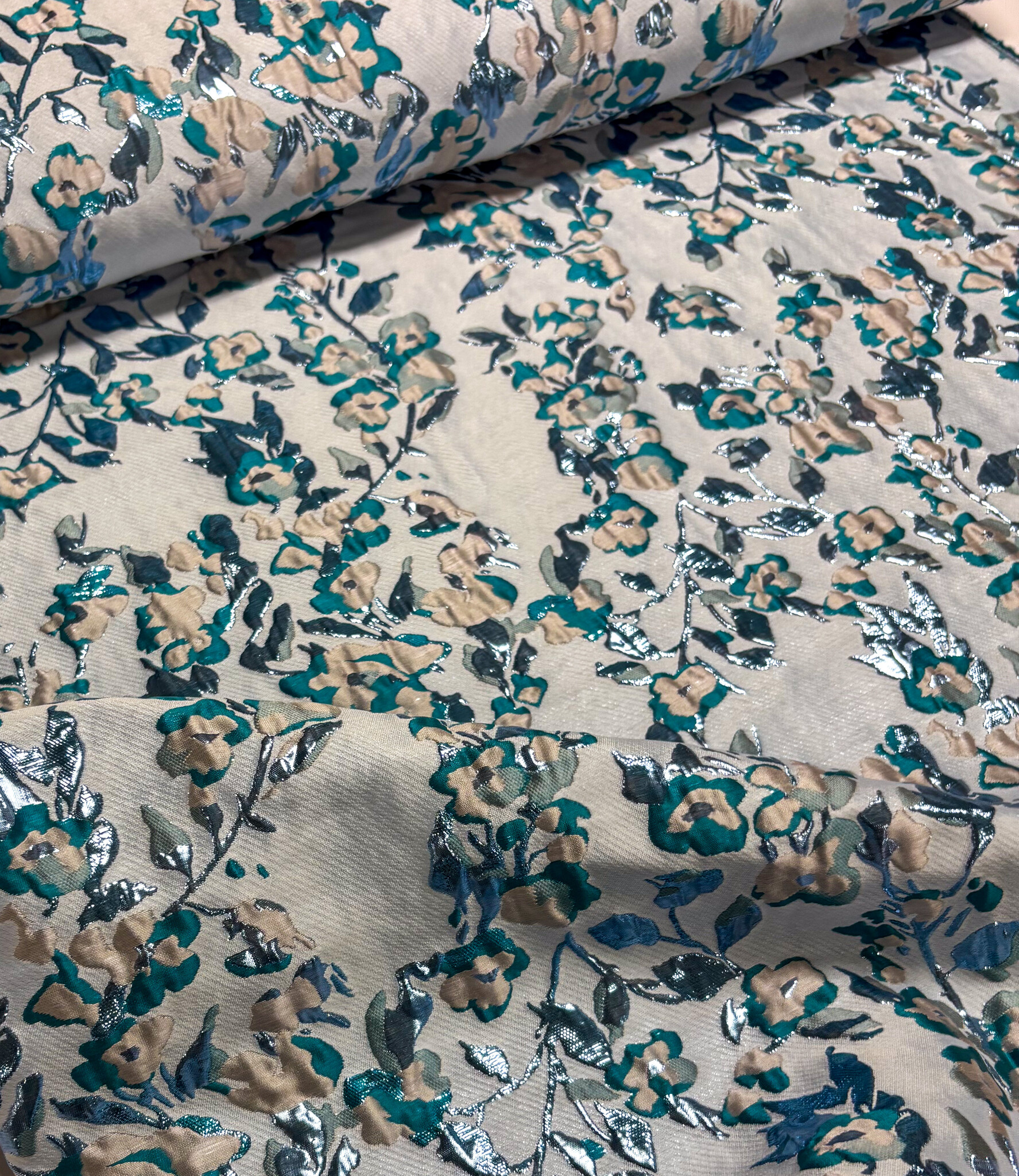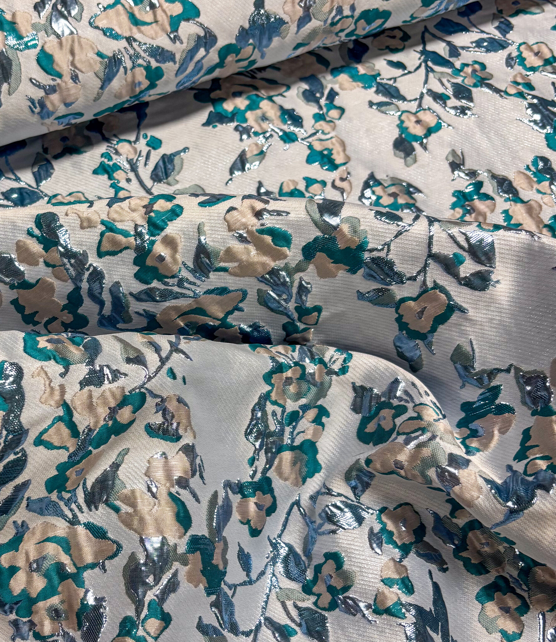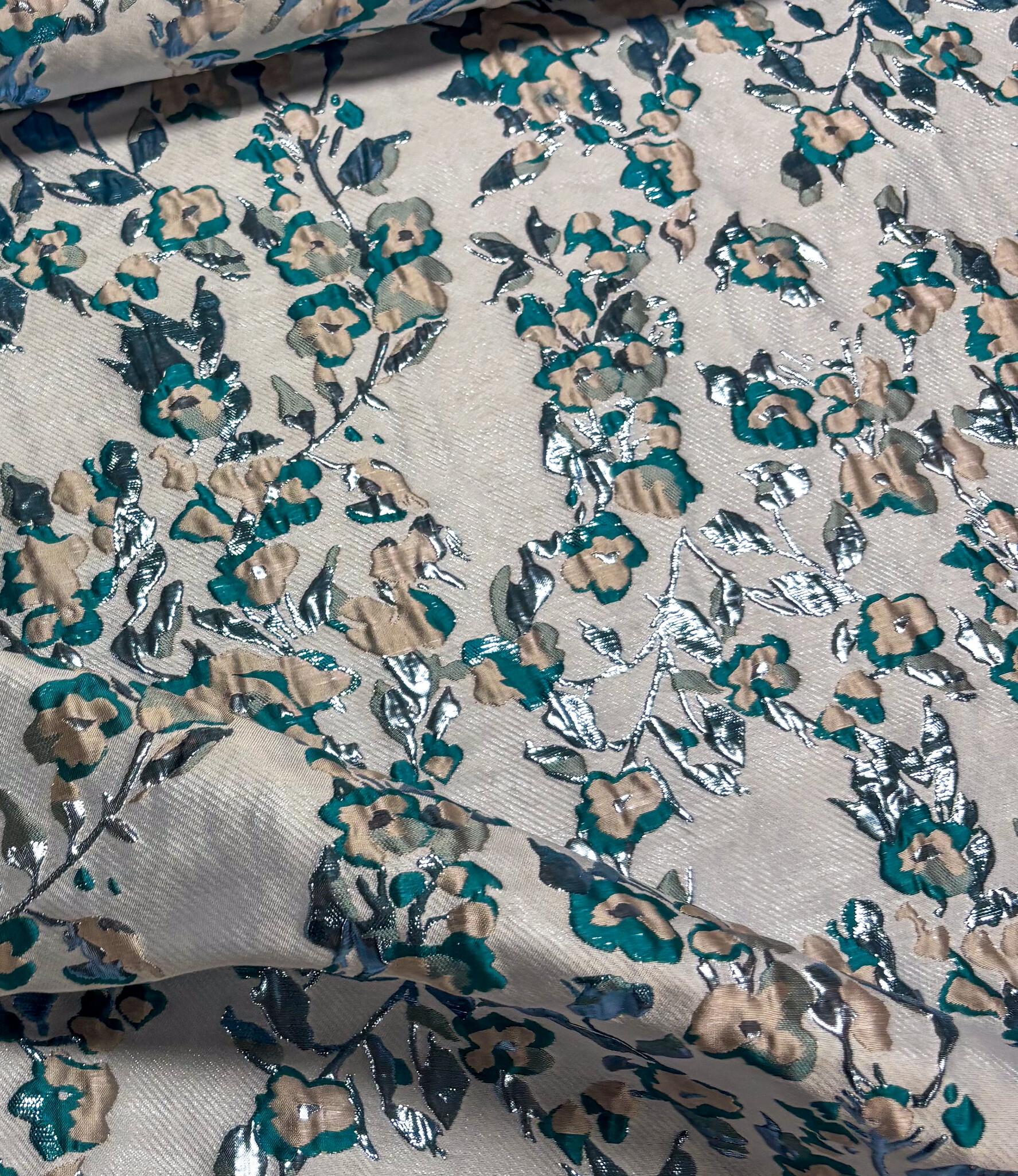 Een prachtige geweven jacquard met bloemen en lurex Dit is een soepele jacquard. Ideaal voor blouses, jurken, rokken en blazers. Maar zeker ook geschikt voor een losse broek. Of als detailmouw bij een sweater of blazer.
