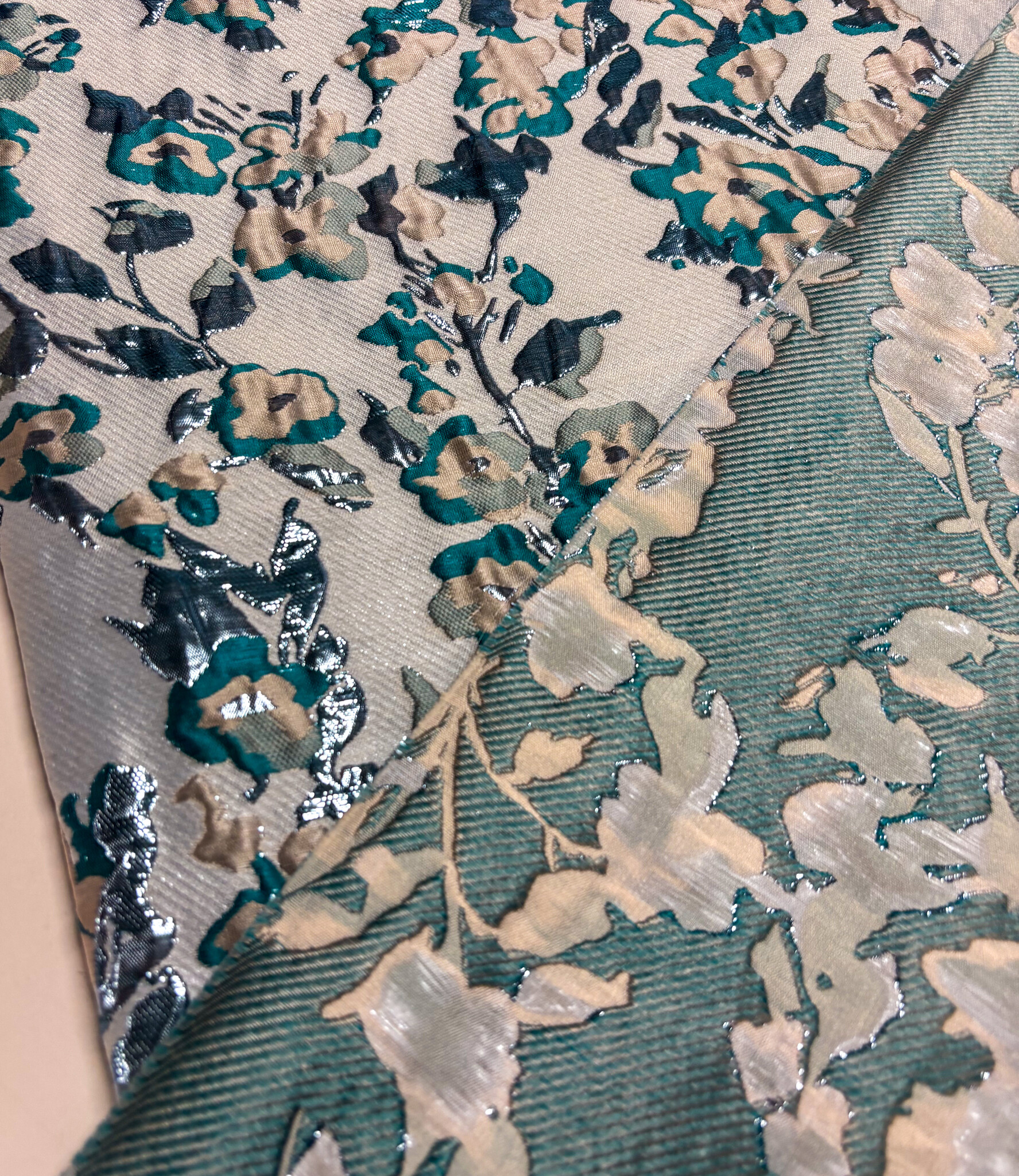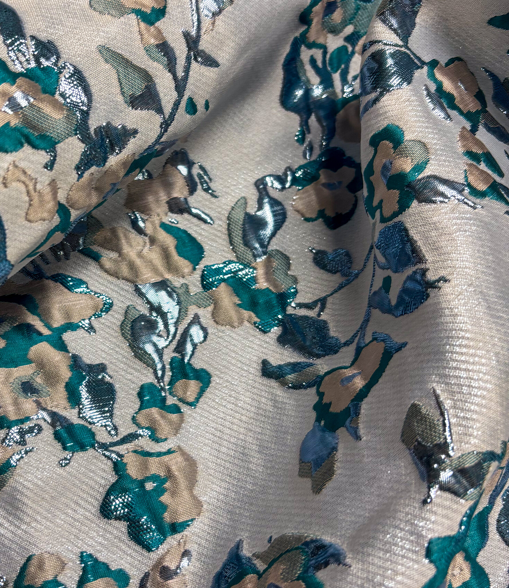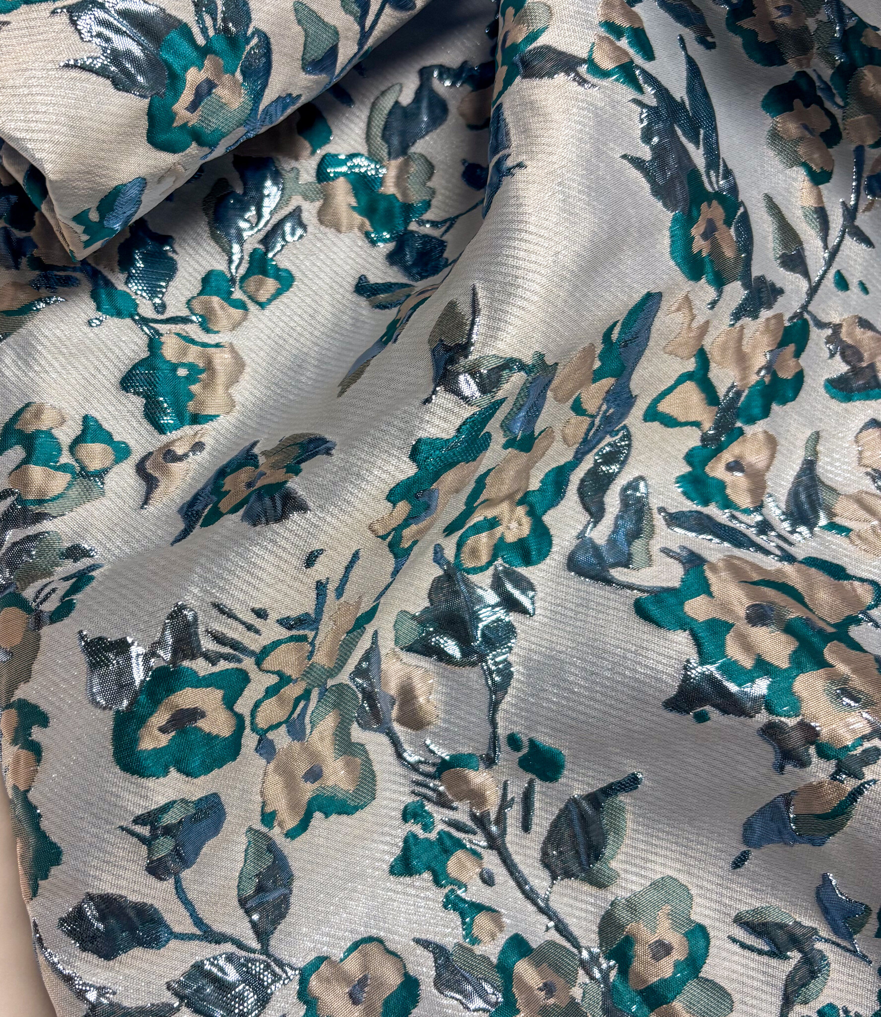 Een prachtige geweven jacquard met bloemen en lurex Dit is een soepele jacquard. Ideaal voor blouses, jurken, rokken en blazers. Maar zeker ook geschikt voor een losse broek. Of als detailmouw bij een sweater of blazer.