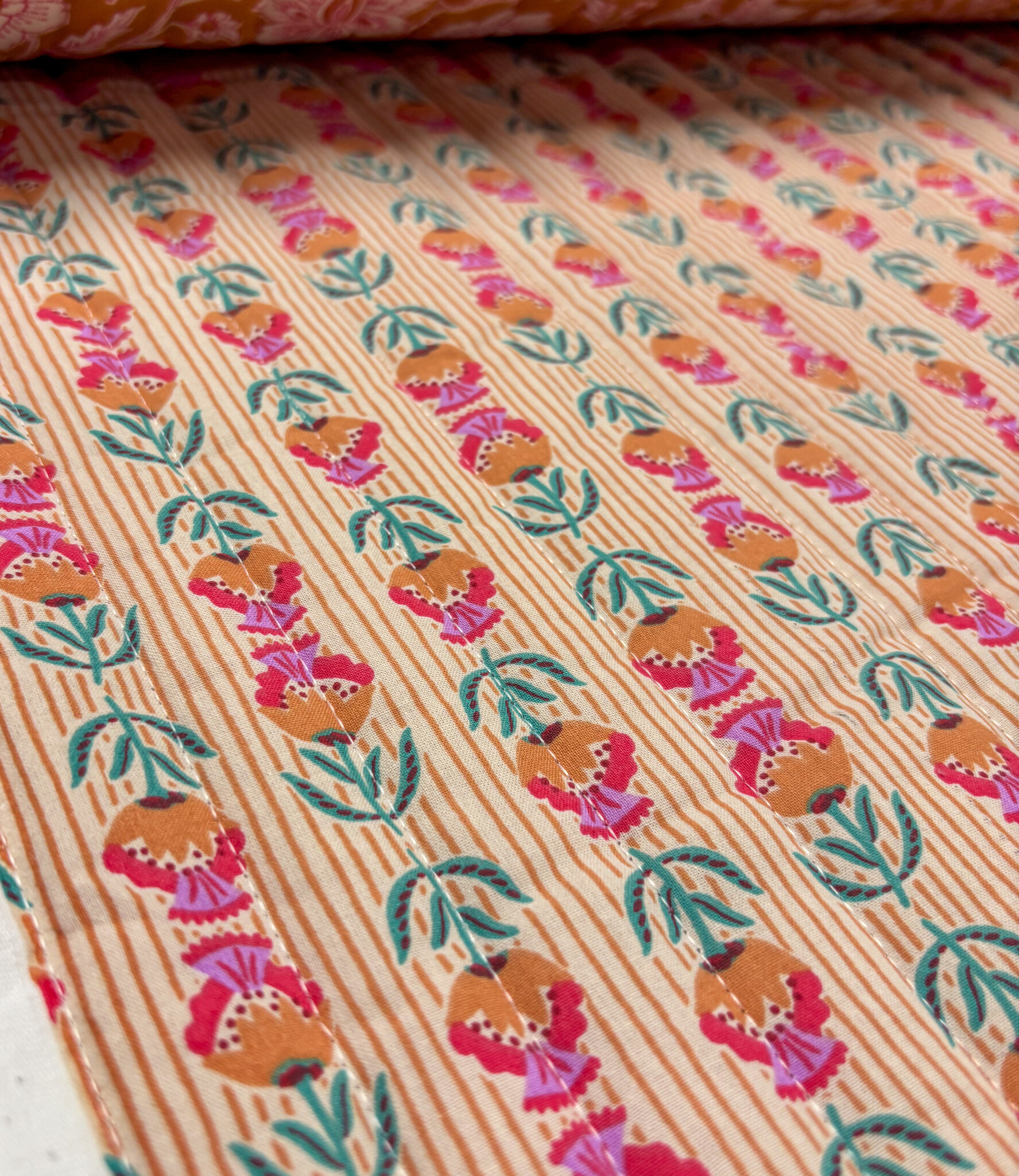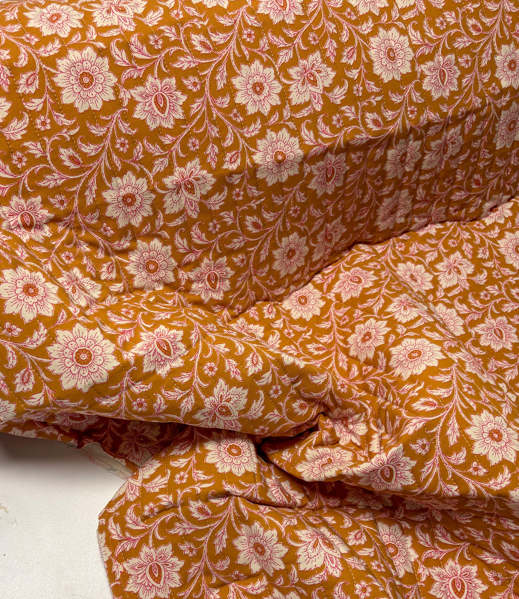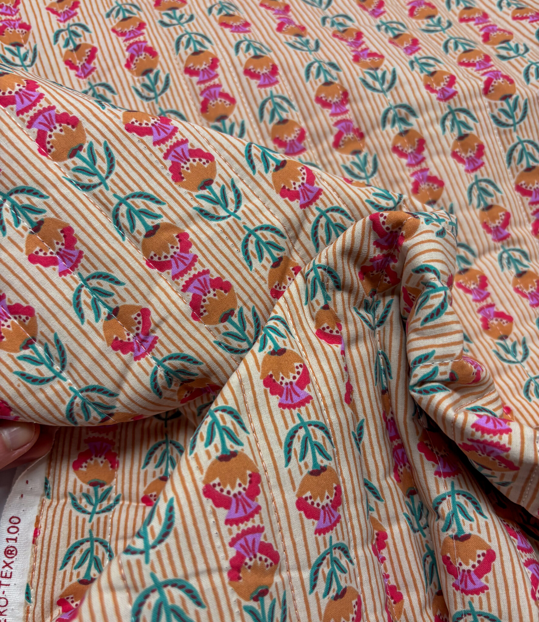 Een gewatteerde katoen met bloemenprint. Double face, dus deze stof is bruikbaar langs beide kanten. Perfect voor jasjes, bodywarmers, dekentjes, toilettasjes, ...
