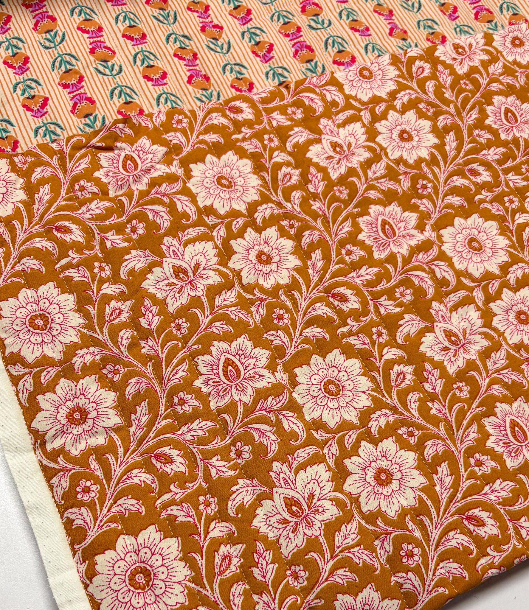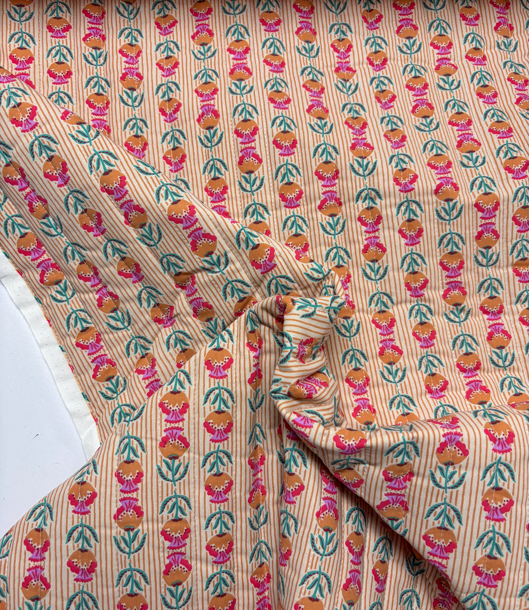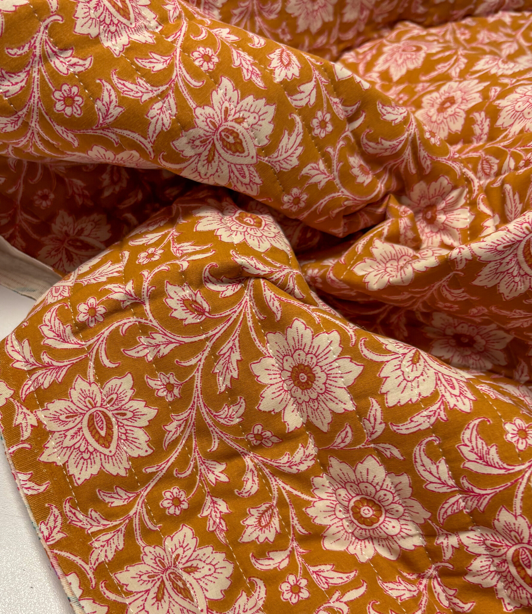 Een gewatteerde katoen met bloemenprint. Double face, dus deze stof is bruikbaar langs beide kanten. Perfect voor jasjes, bodywarmers, dekentjes, toilettasjes, ...