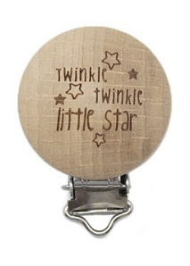 Een schattige fopspeenklem van glad hout met tekst "Twinkle twinkle little star".