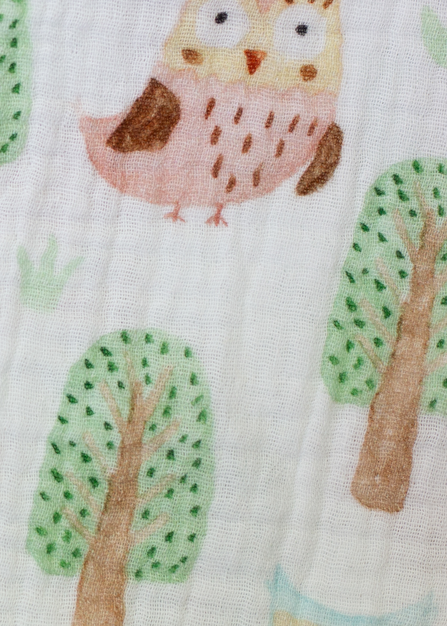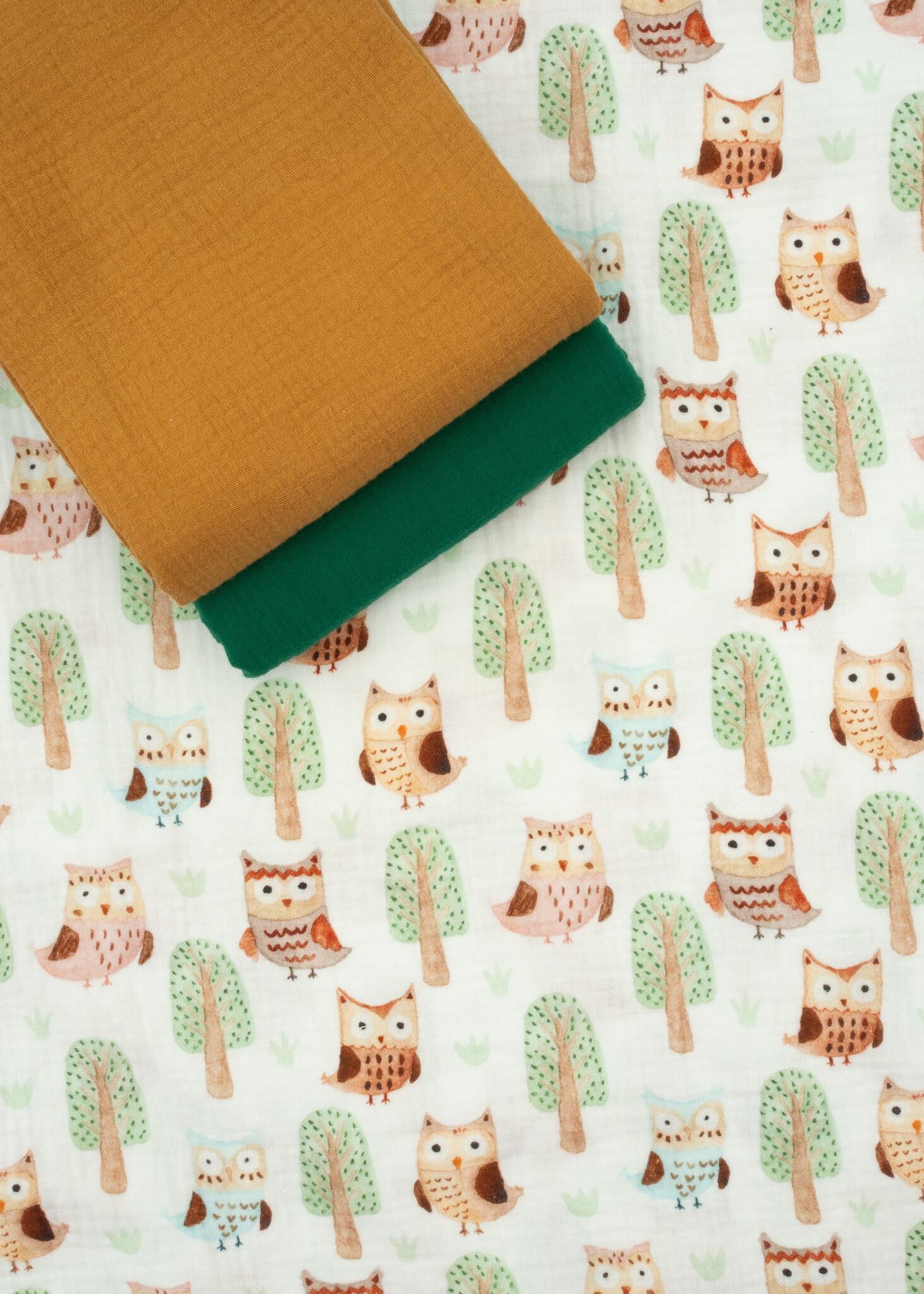 Een zachte tetra stof met een leuke uiltjesprint. Ideaal voor een dekentje of lakentje, kinderkleertjes, tuttendoekjes, ...