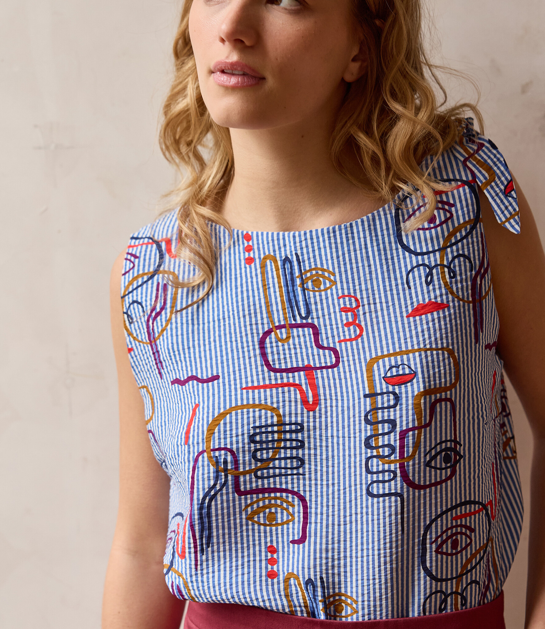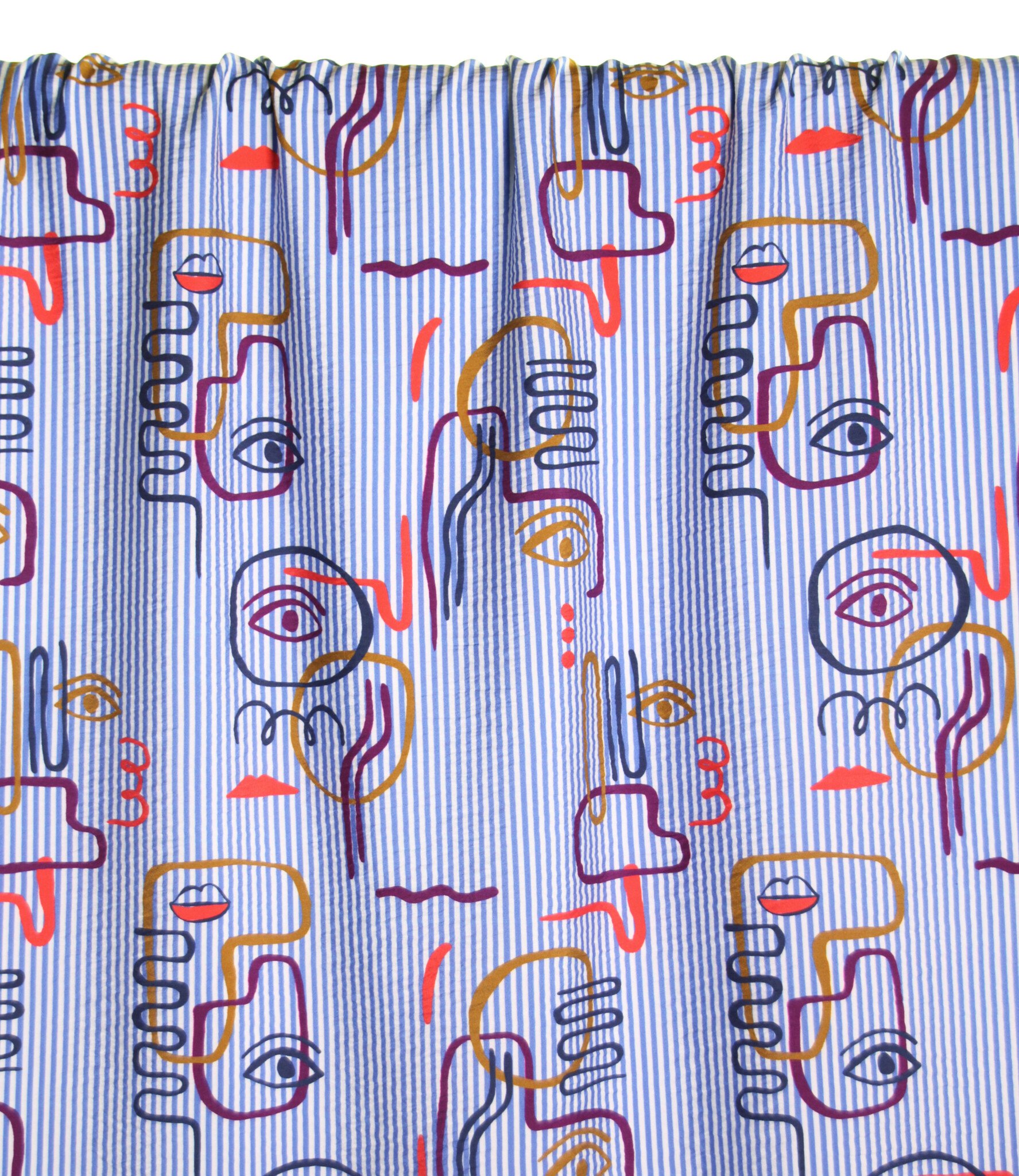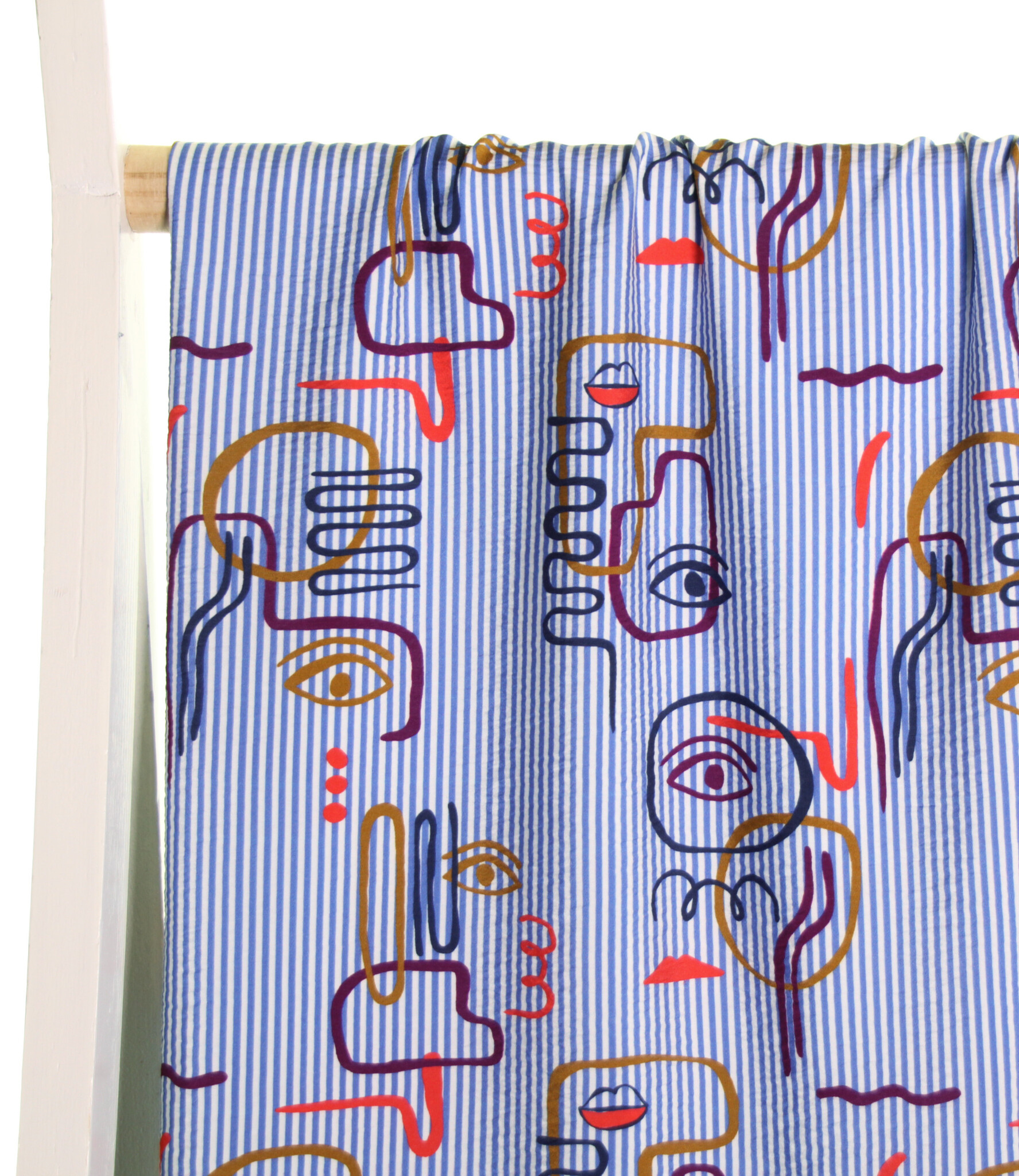 Een viscose/polyamide mix met lichte textuur, die wat 'gebobbeld' lijkt en een subtiele satijnglans. De stof heeft wit en blauwe lijntjes met daarop een grafische print van ogen en gezichtjes. Deze stof is geschikt voor blouses, jurken, rokken,...