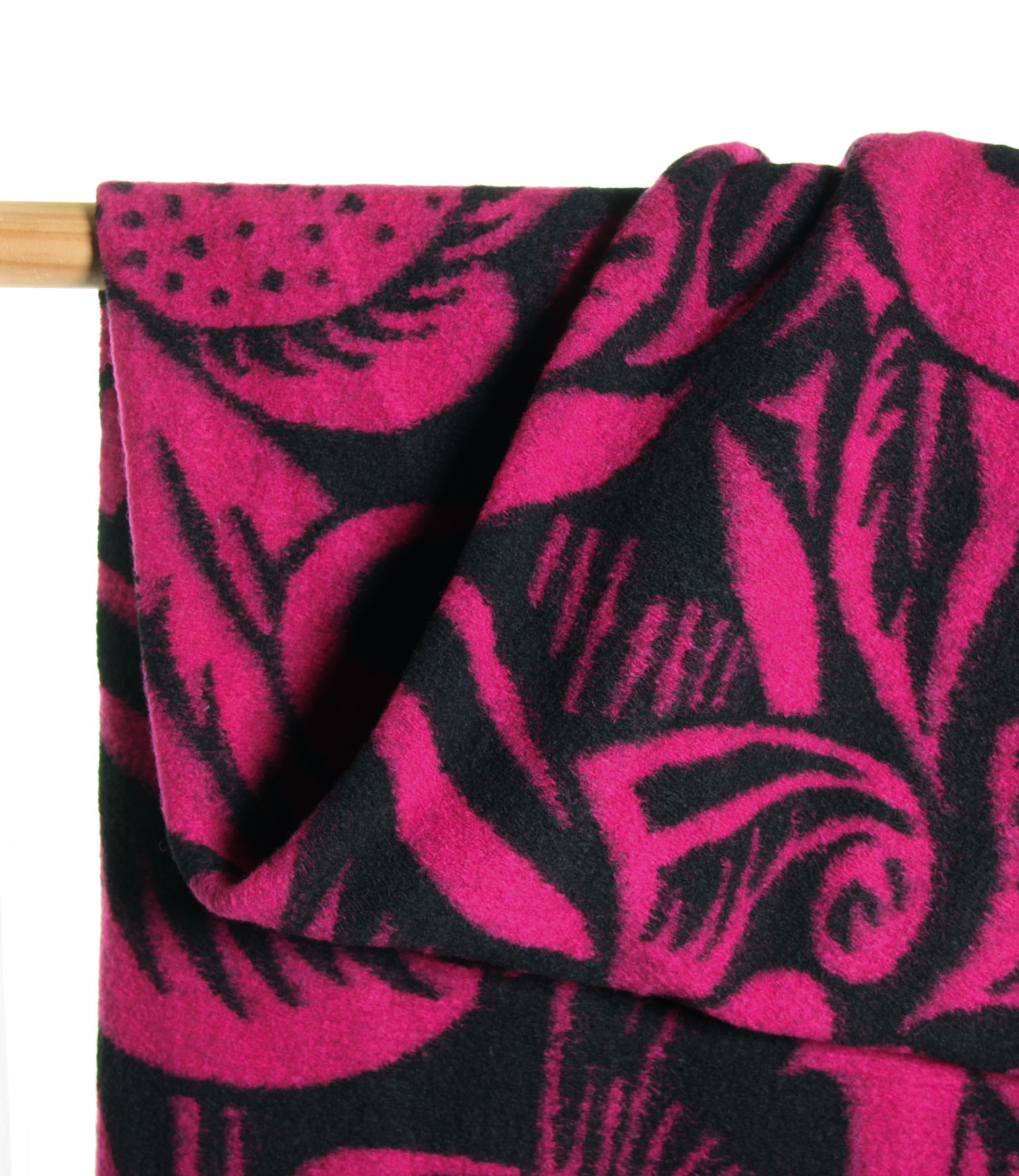 Een zachte winterstof in een mix van wol & polyester. De stof heeft een grote artistieke bloemenprint in zwart en fuchsia en komt nog in 2 andere kleurvarianten. Perfect voor sweaters en jasjes. Dit is een gebreide stof. Gemaakt in Italië.