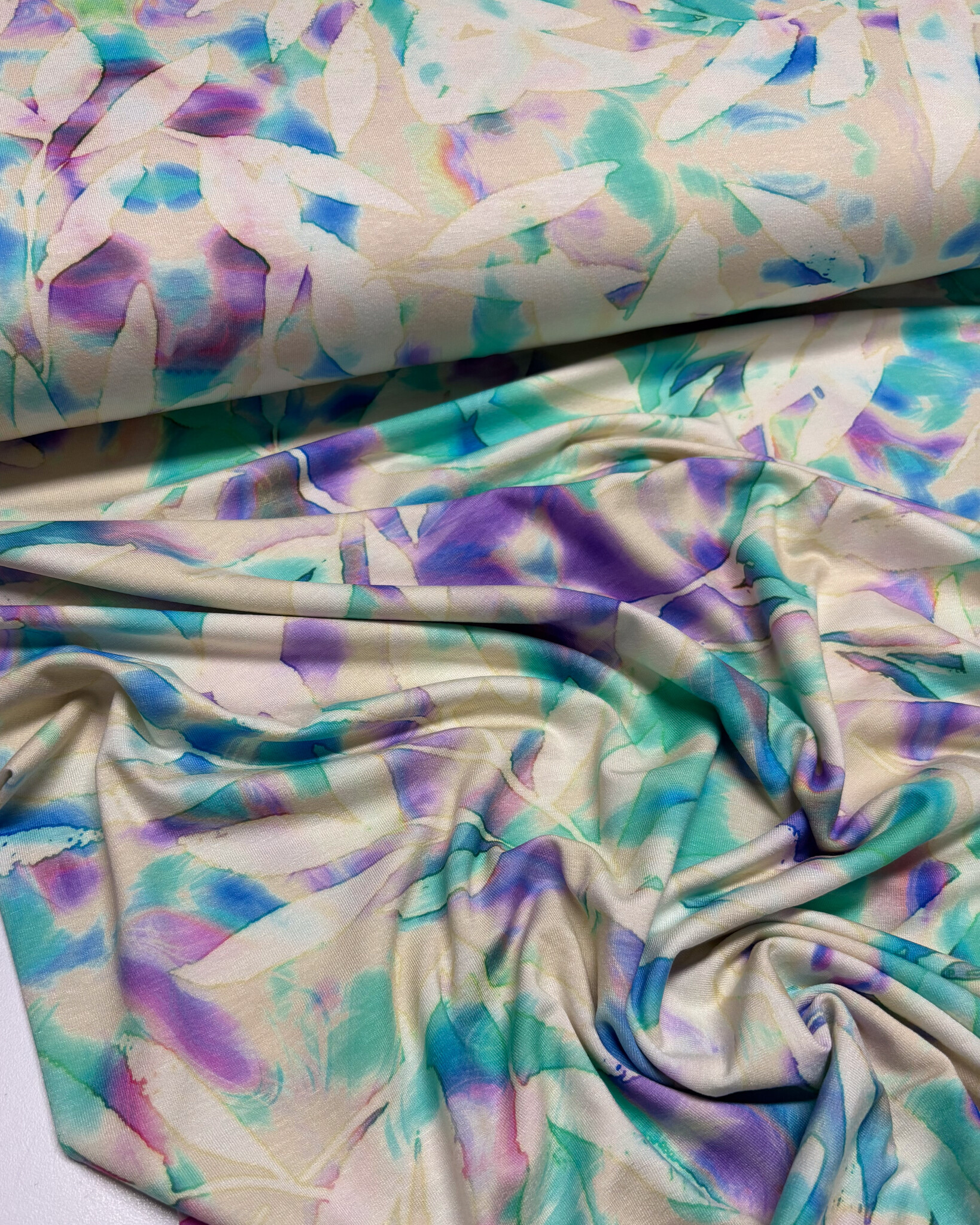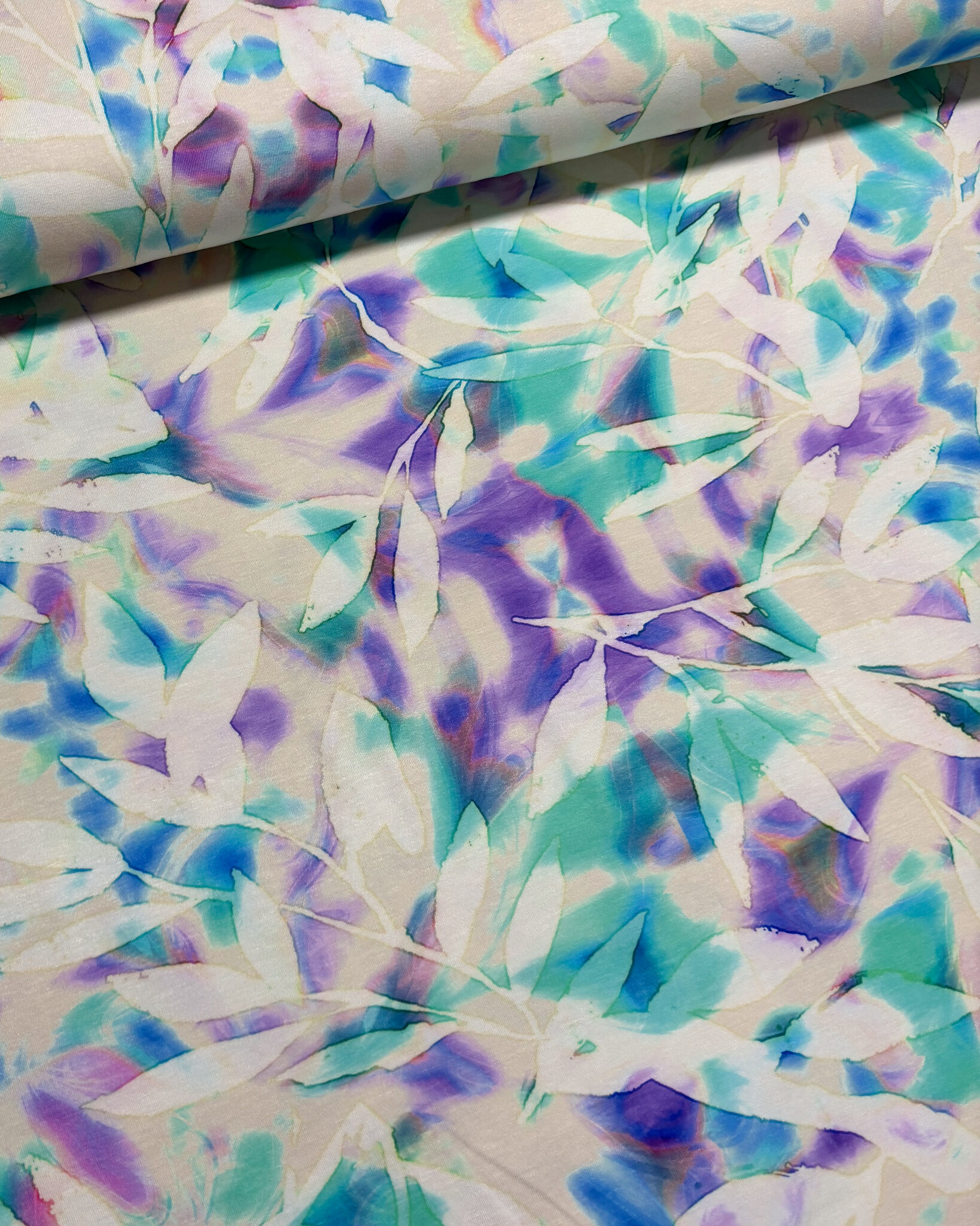 Een fijn viscose tricot met zomerse print. OEKO TEX. Zachte en soepelvallende stof, zeer geschikt voor T-shirts en sportieve jurken voor dames.