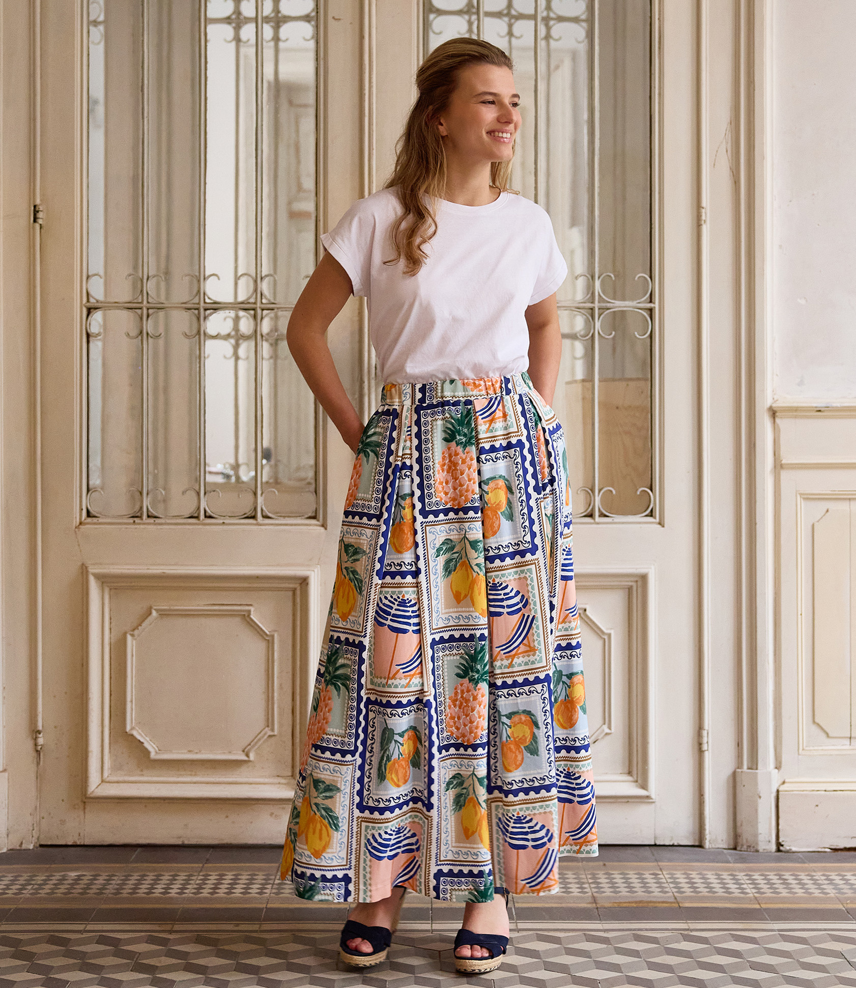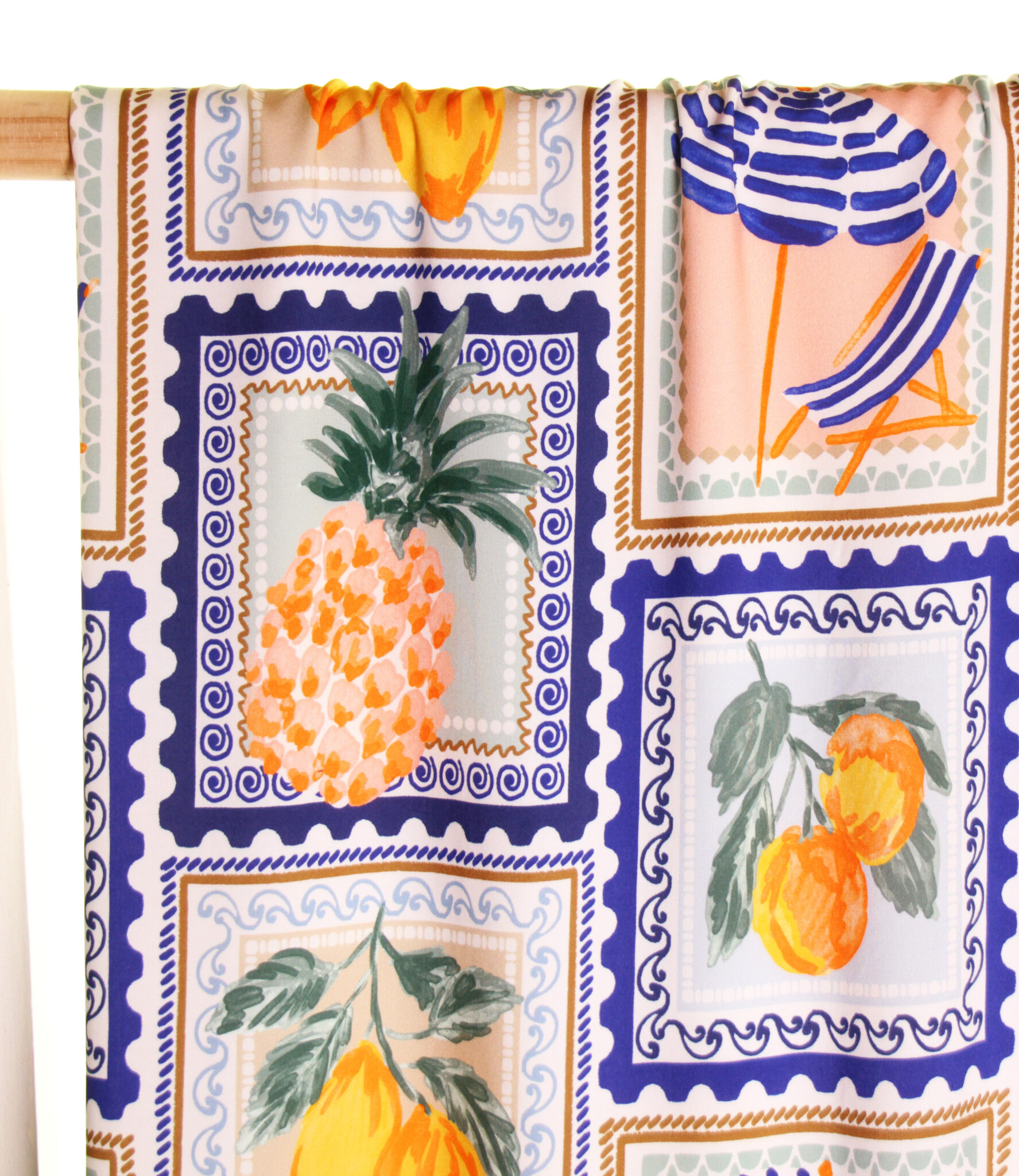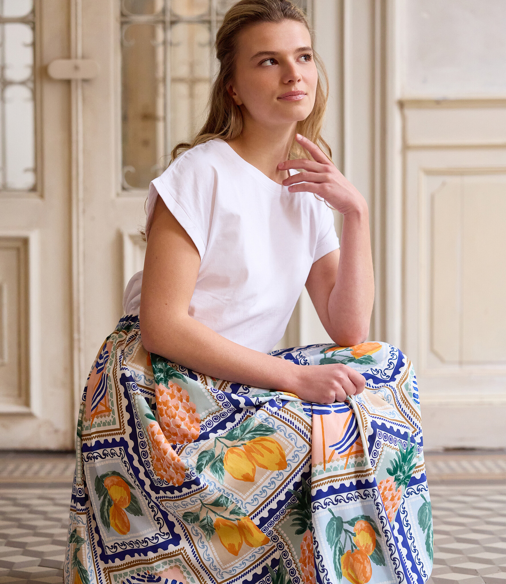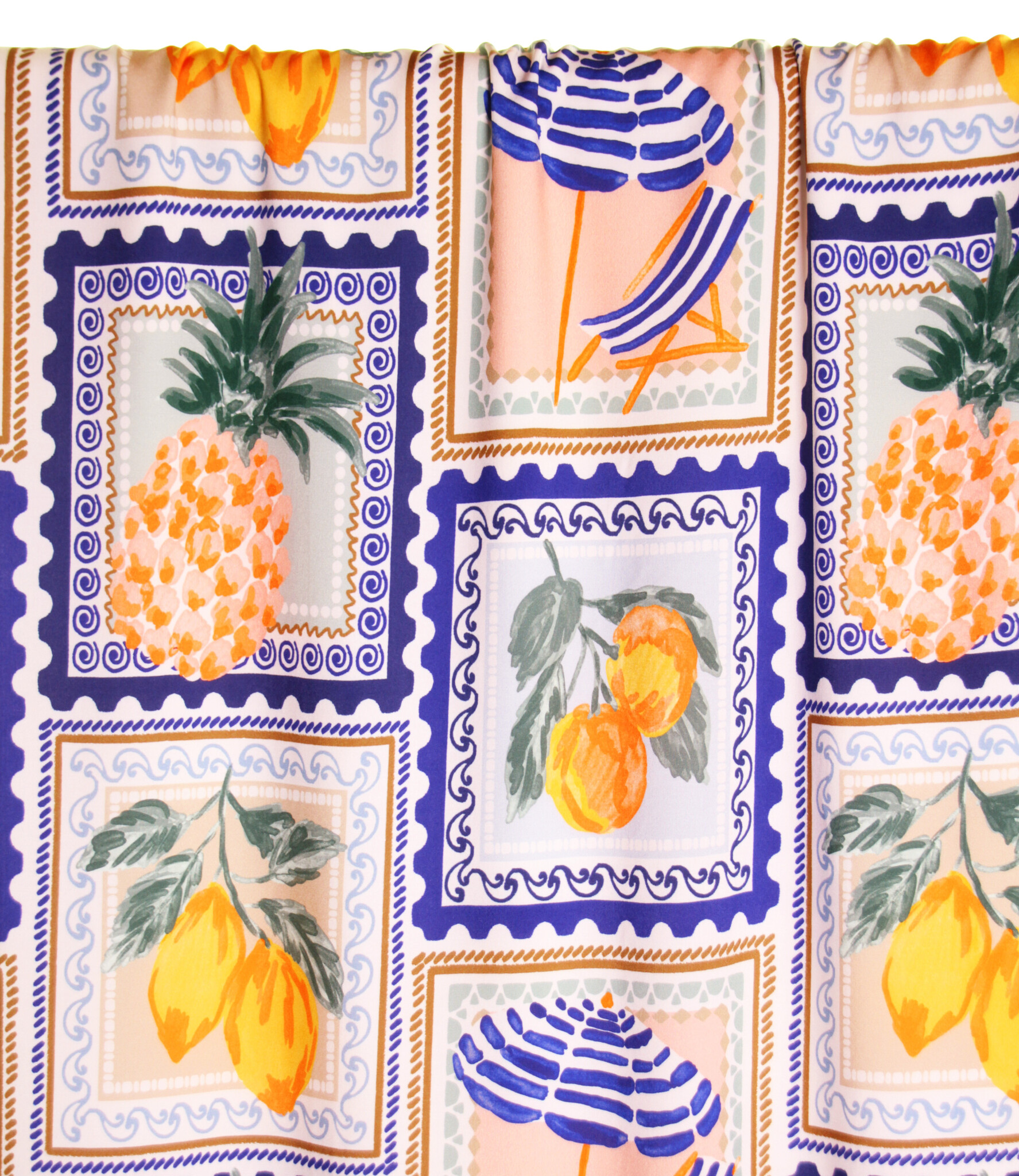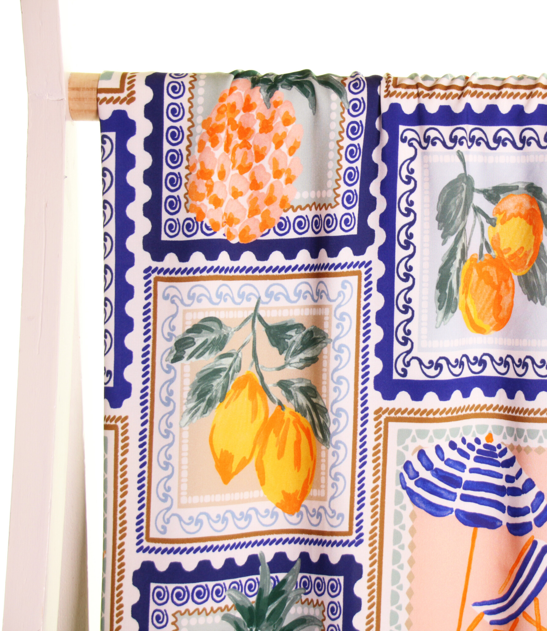 Een witte viscose met overall Mediterraanse tegel-print met o.a. zomers fruit... in kleuren als blauw, groen en warme citrus-kleuren. Deze stof is geschikt voor blouses, jurken, rokken,...