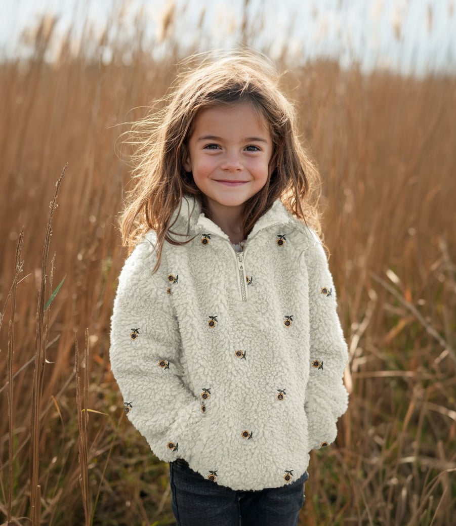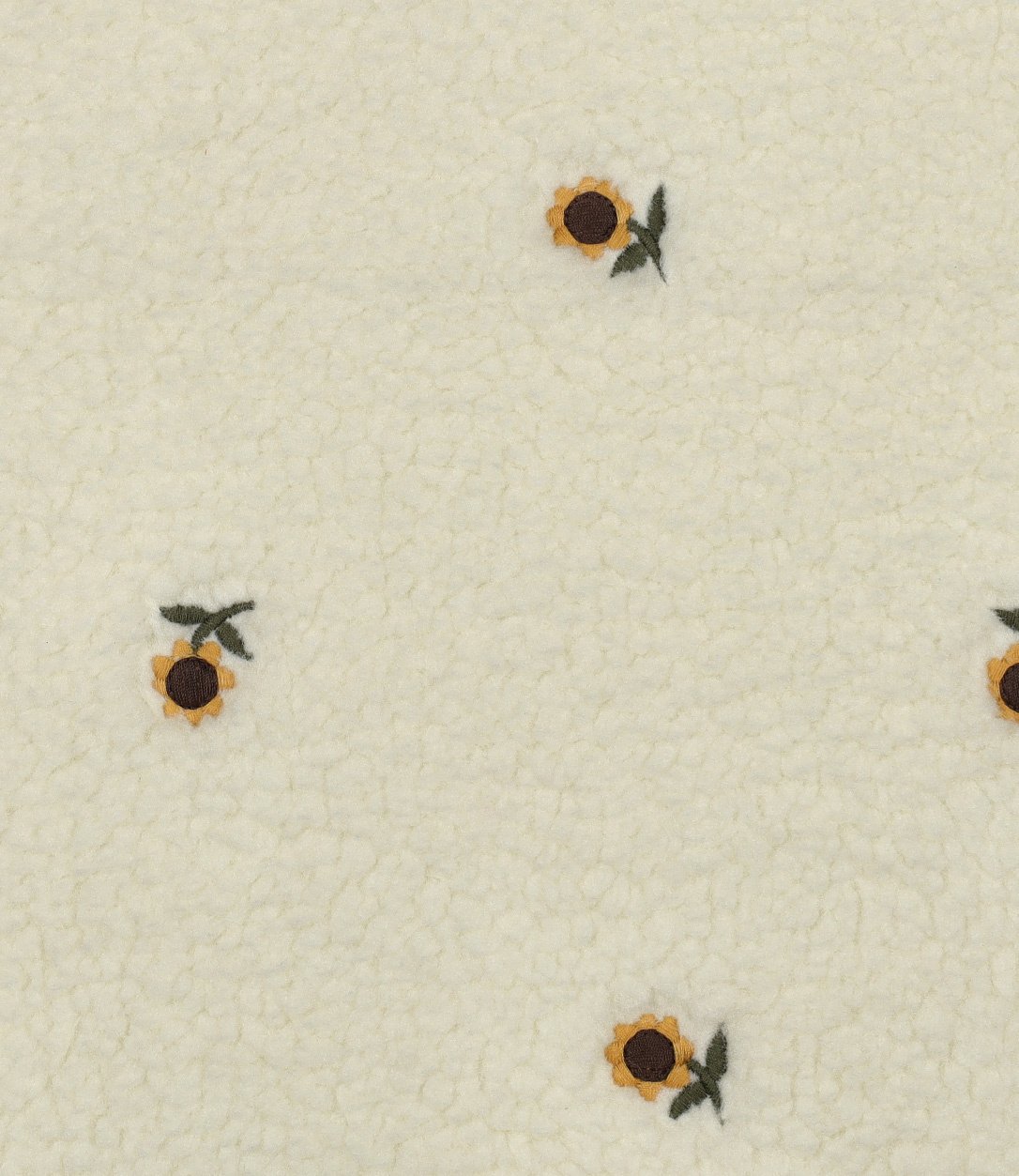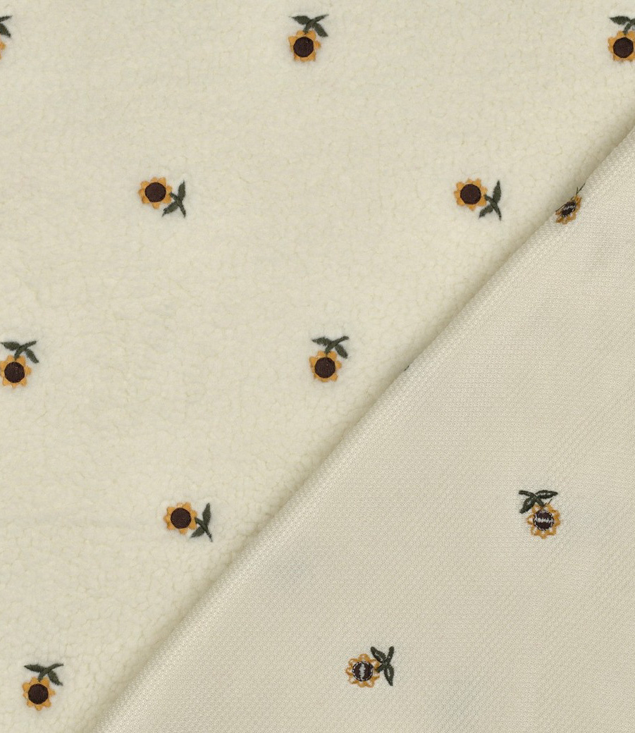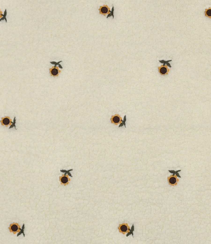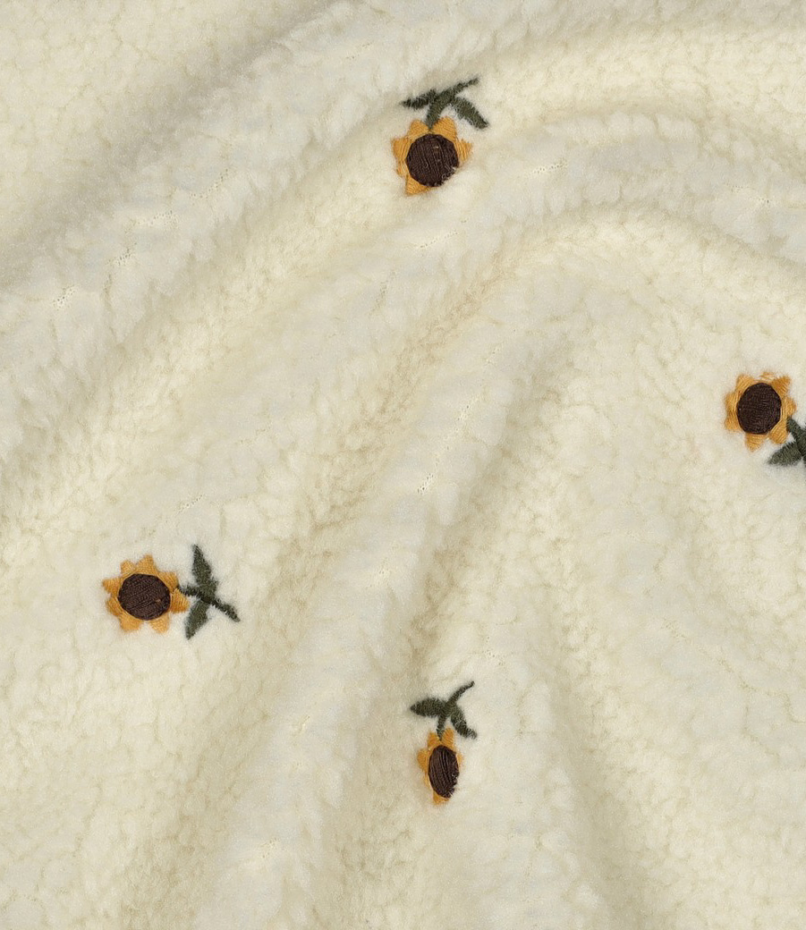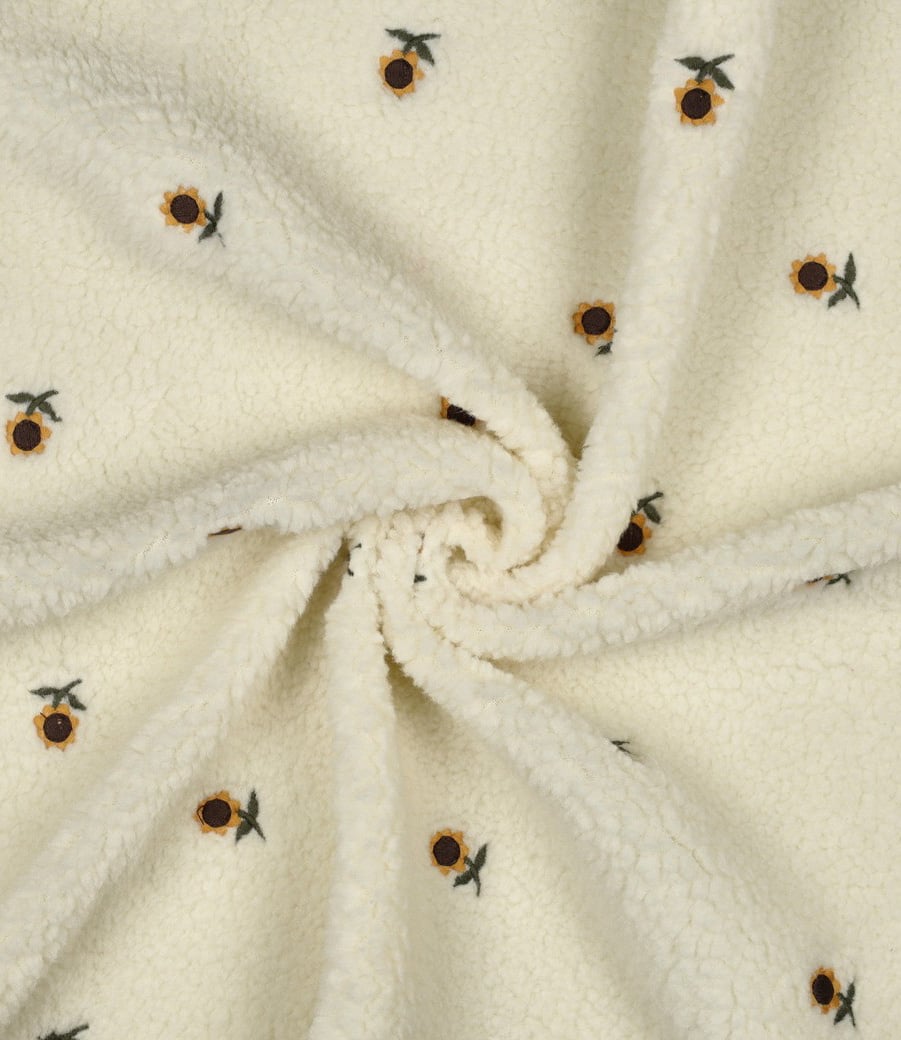 Een teddy fleece met geborduurde zonnebloemetjes.