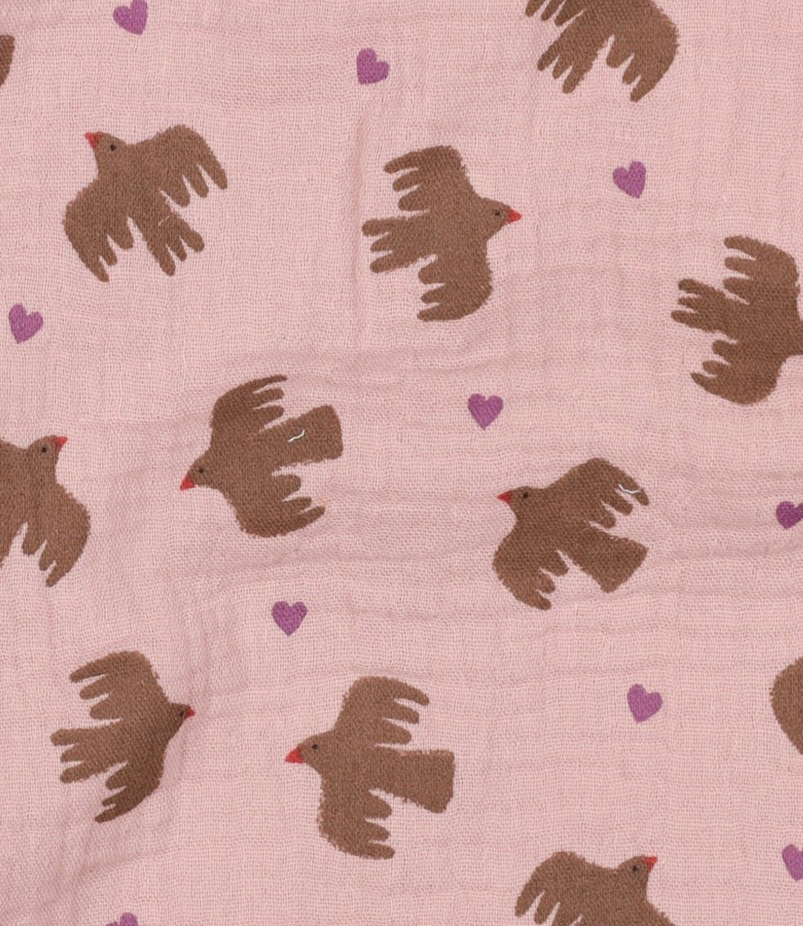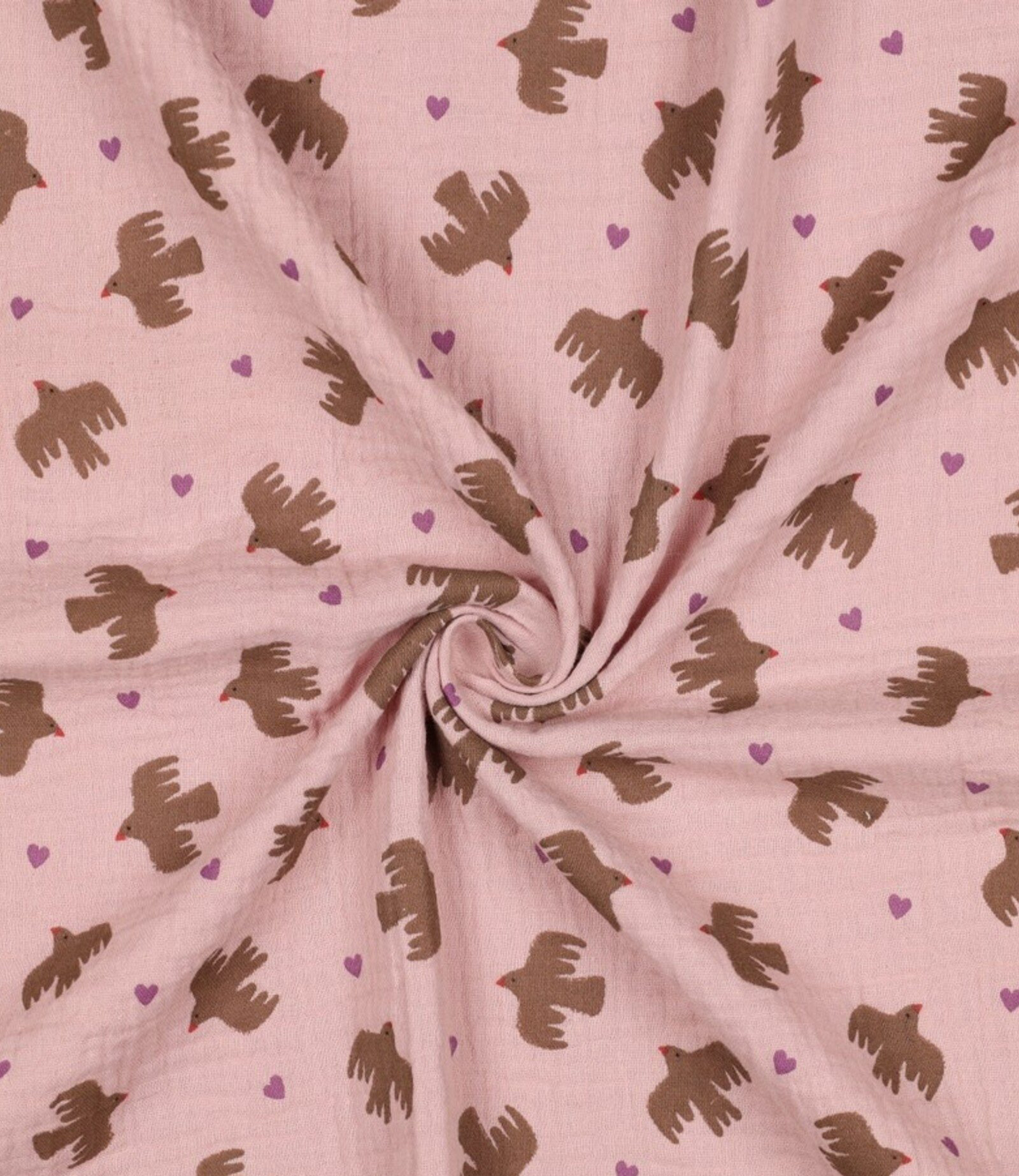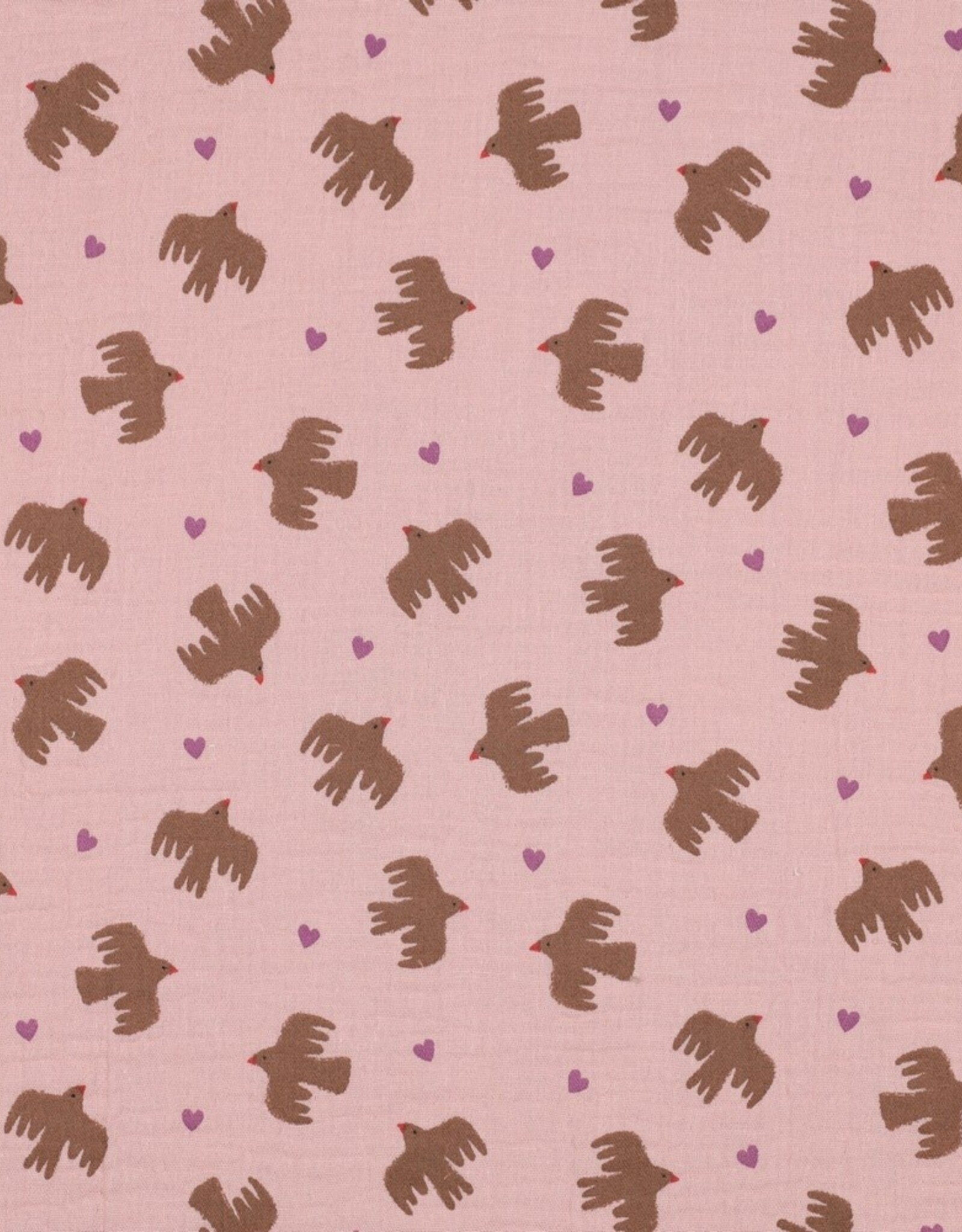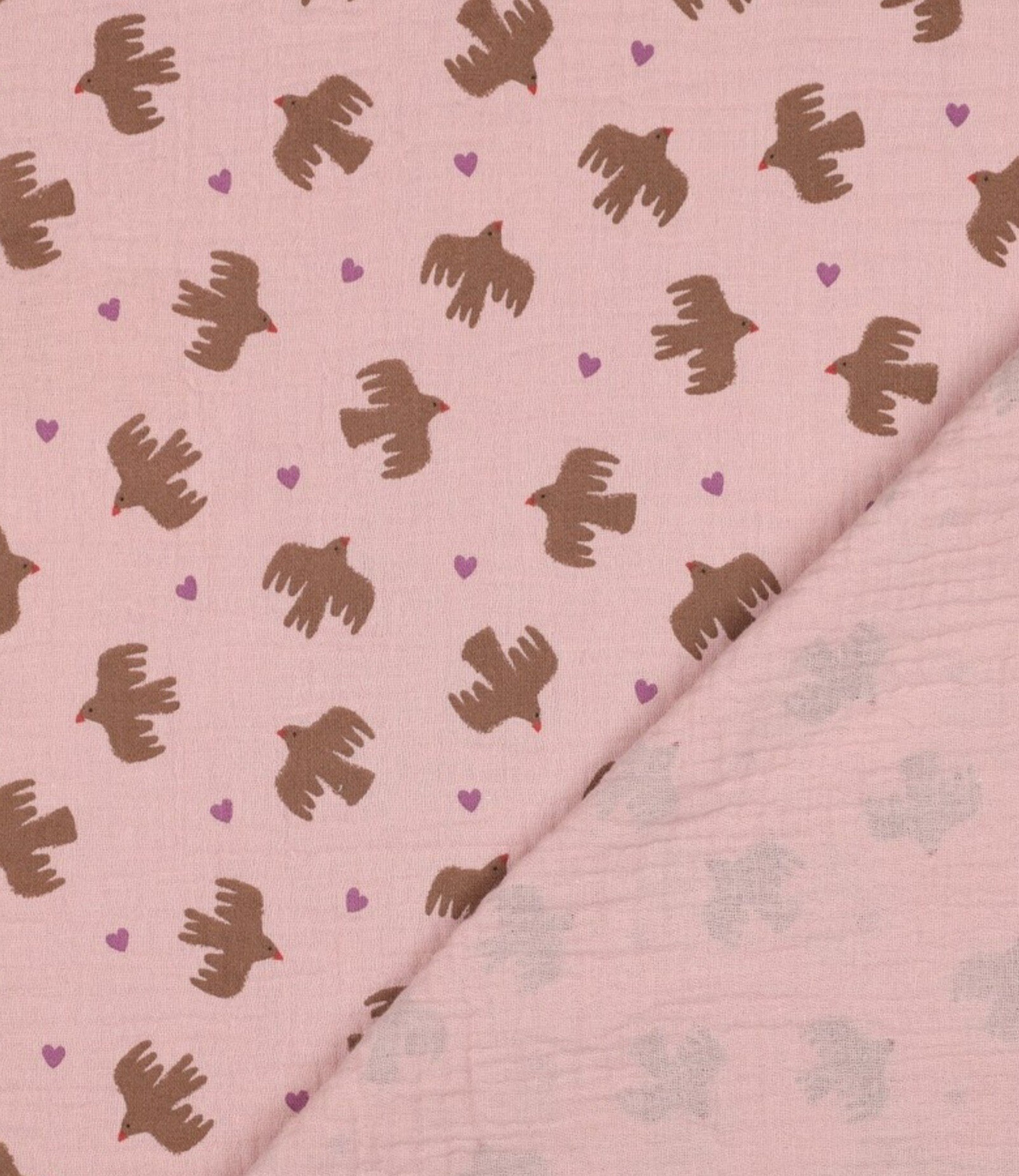 Mooie kwaliteit double gauze met zwaluwen en kleine hartjes. Perfect kleedjes, tops, T-shirts en voor baby- en kinderspulletjes (babynestje, dekentje, ...). Heerlijk zacht. OEKO-tex.