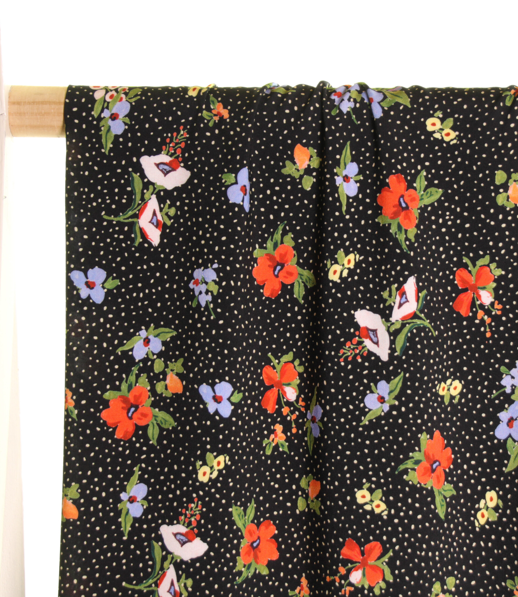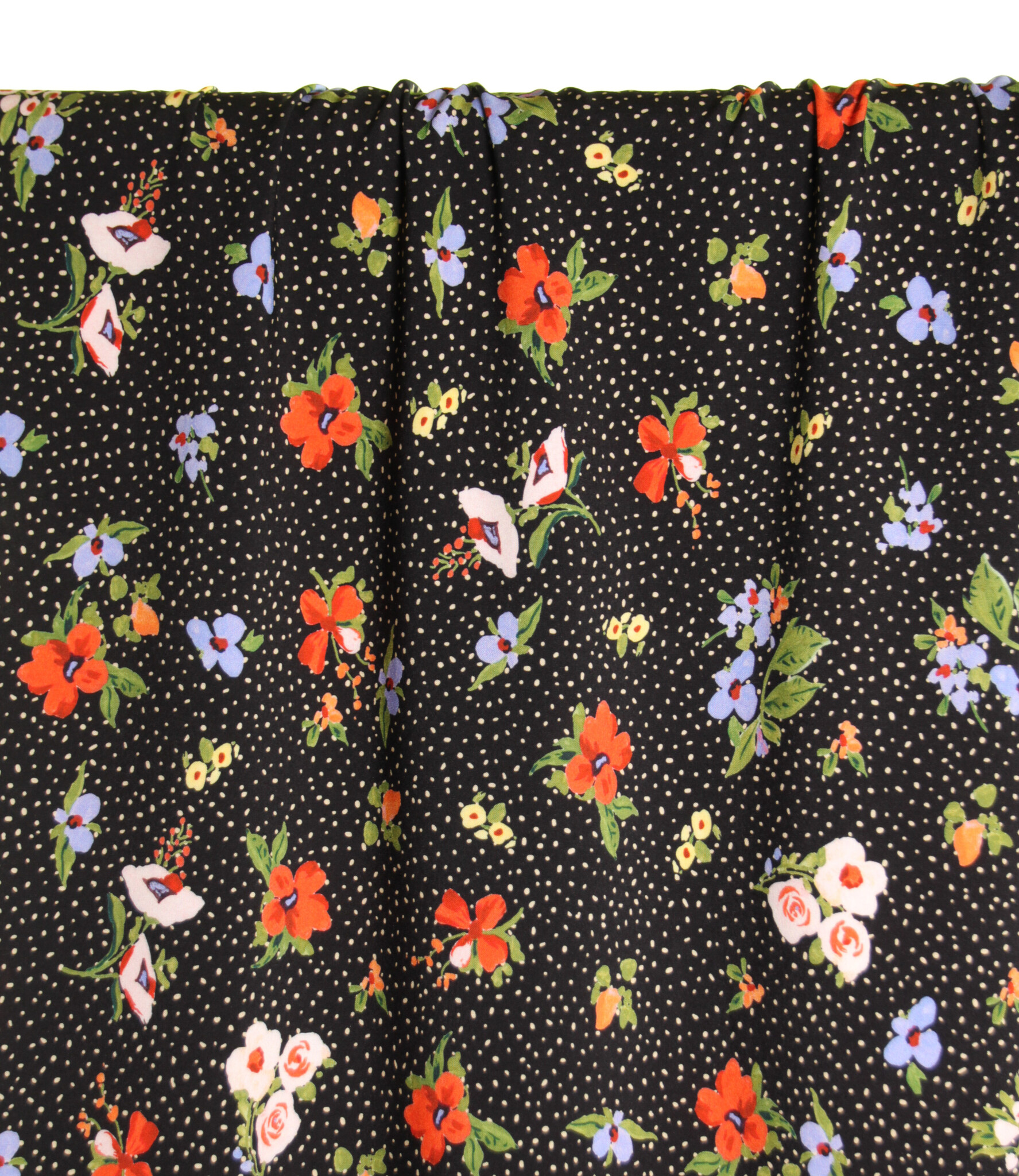 Een fijne, zwarte katoen met witte stippen en kleine bloemen in wit, rood, blauw, groen... Deze stof is geschikt voor blouses, jurken, rokken,...