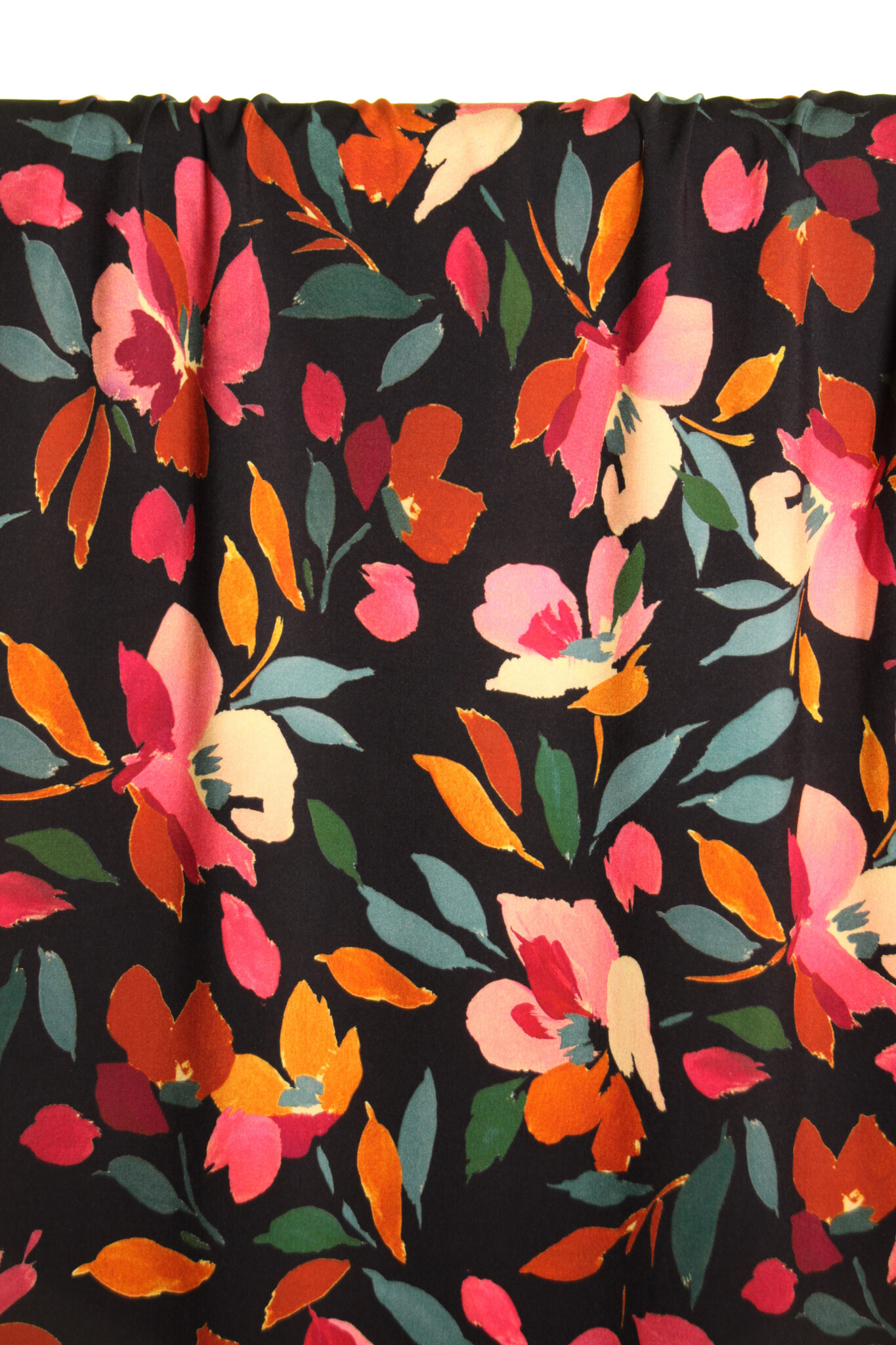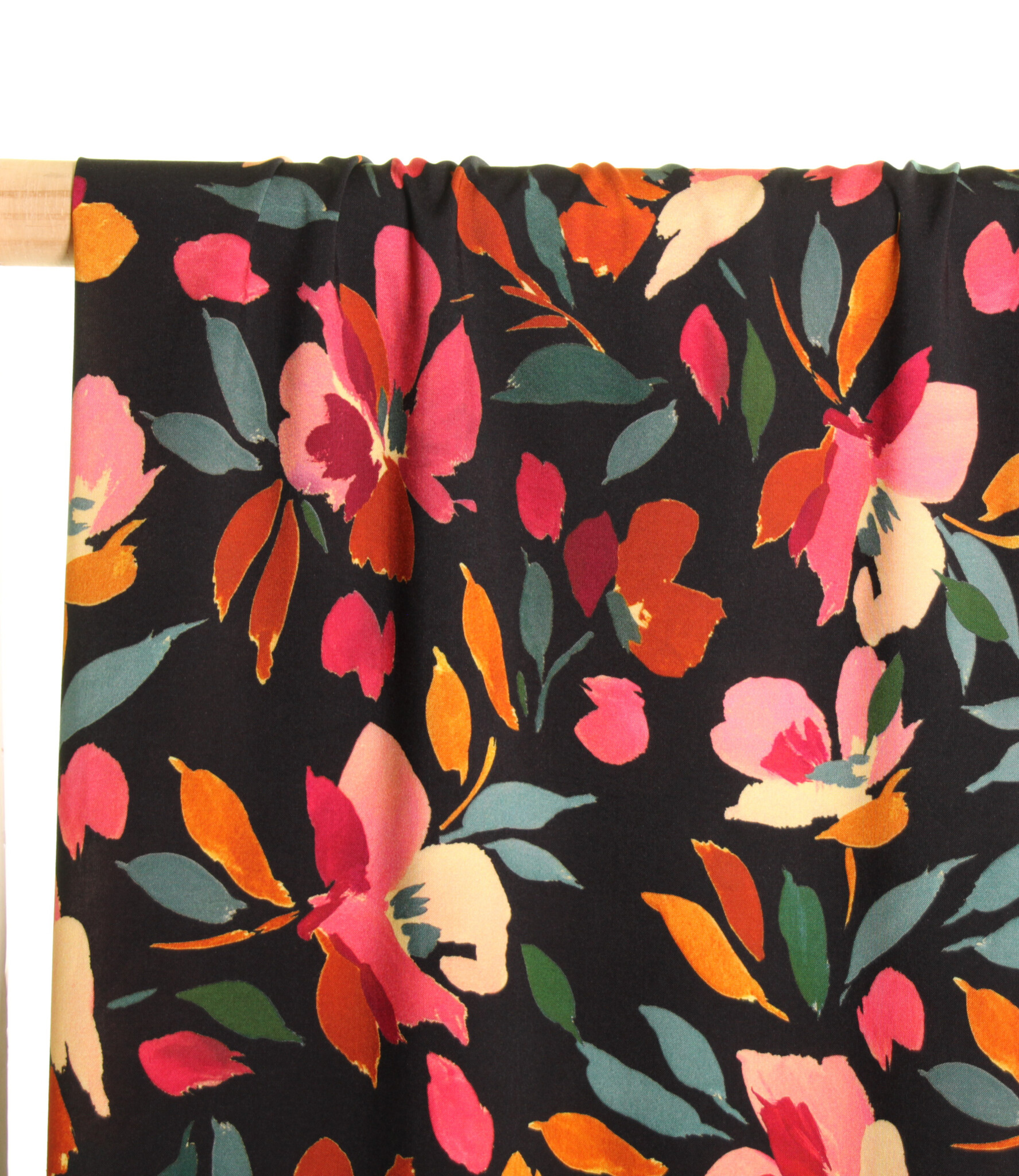 Een zwarte viscose met kleurrijke bloemenprint. Deze stof is geschikt voor blouses, jurken, rokken,...